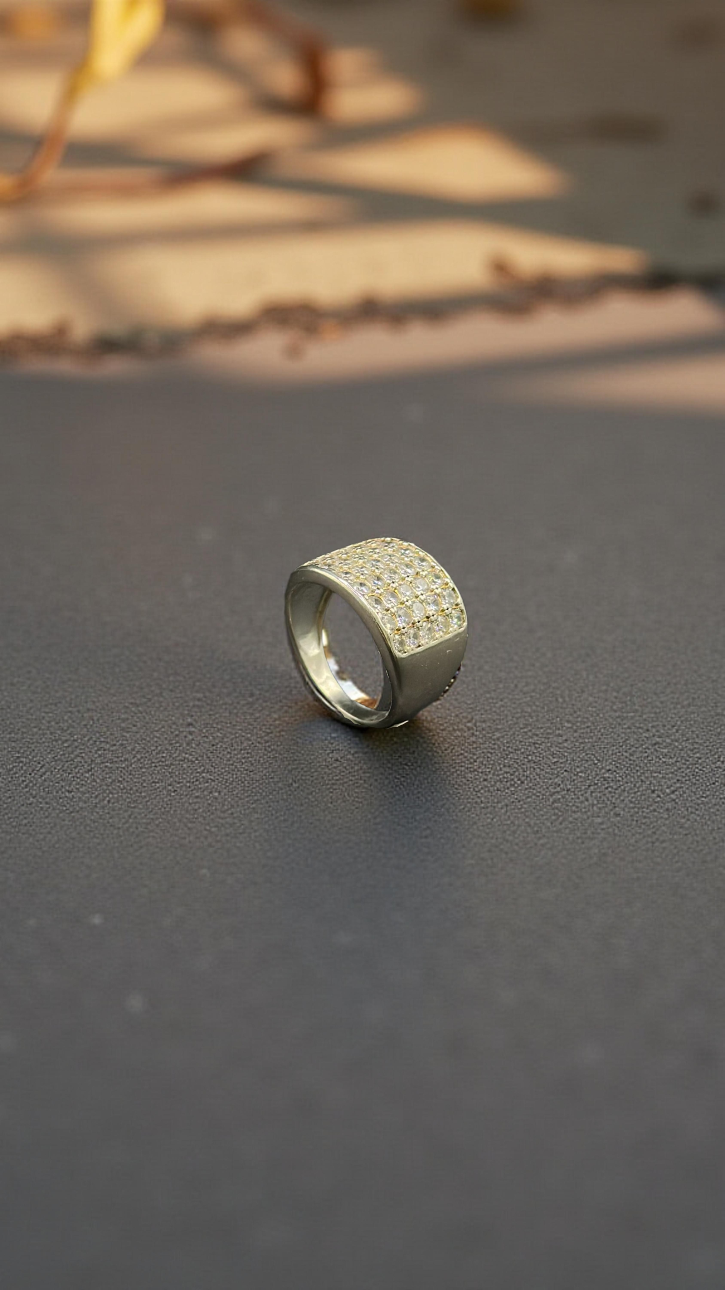 A bold, regal ring encrusted with rows of sparkling gems, exuding power and opulence in every facet.