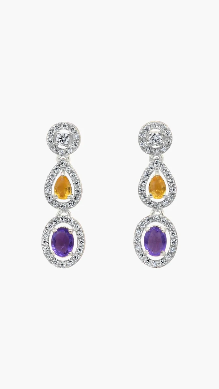 SKU: QZ-SER37 Weight: 9g Purity: 925 Elegant drop earrings featuring dazzling white stones, golden citrines, and deep amethysts set in shimmering silver halos.