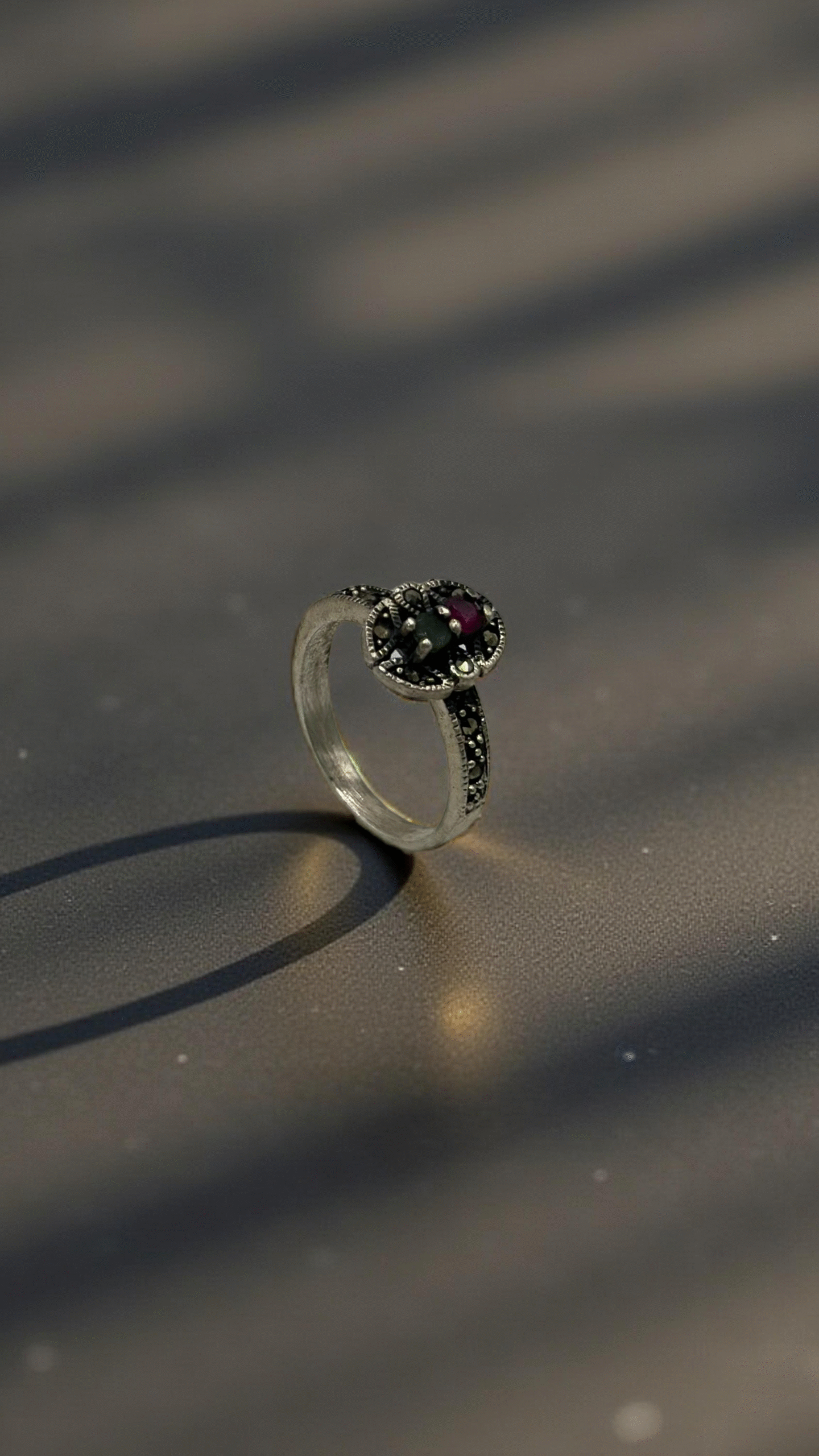 SKU: QZ-SR88 Weight: 4.07g Purity: 925 Blossom Midnight is an enchanting silver ring featuring rich colored gemstones, delicately set in intricate detailing that evokes the mysterious beauty of a blooming flower in the depths of night.