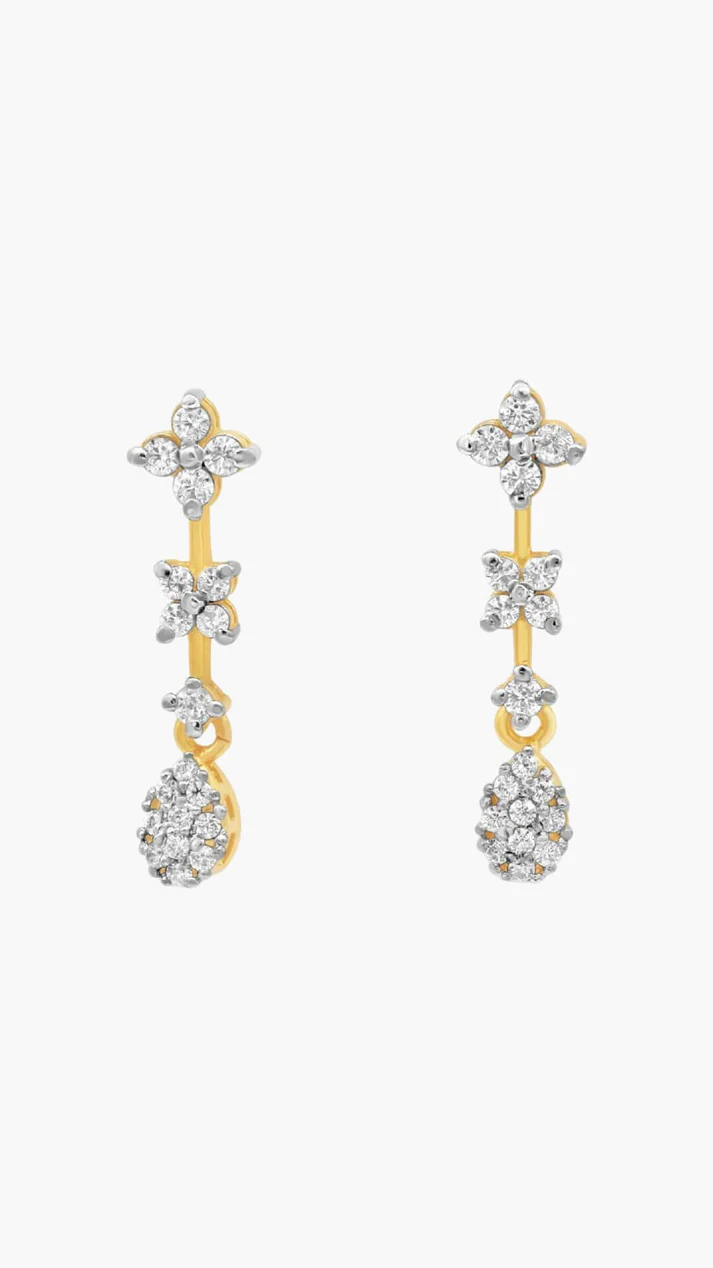 Graceful gold drop earrings adorned with floral diamond clusters, radiating timeless elegance and charm.