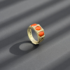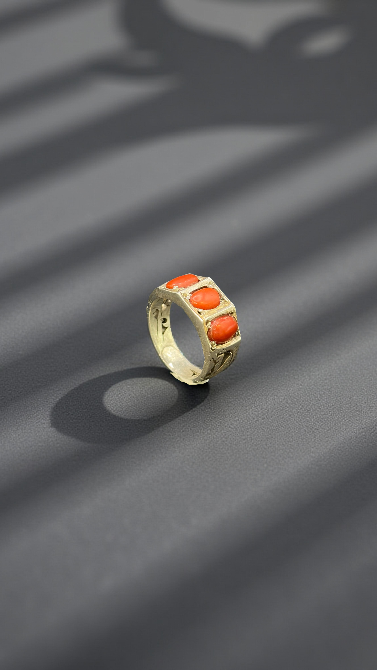 A vintage gold ring featuring three vibrant coral stones set in individual square bezels, symbolizing unity and elegance.