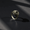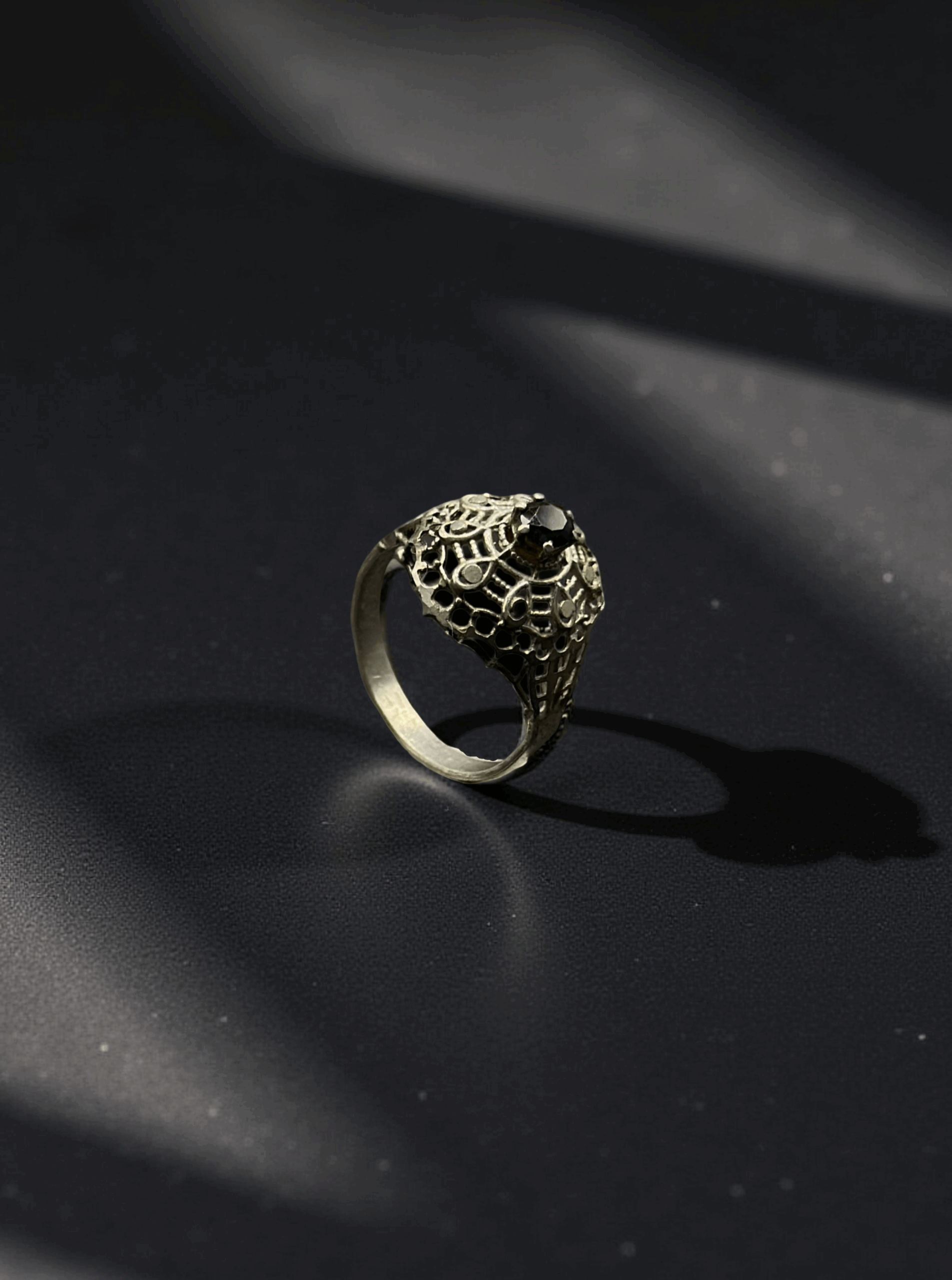 SKU: QZ-SR35 Weight: 1.85g Purity: 925 A bold vintage-style ring featuring intricate filigree metalwork crowned with a mysterious black stone, exuding old-world charm and gothic elegance.