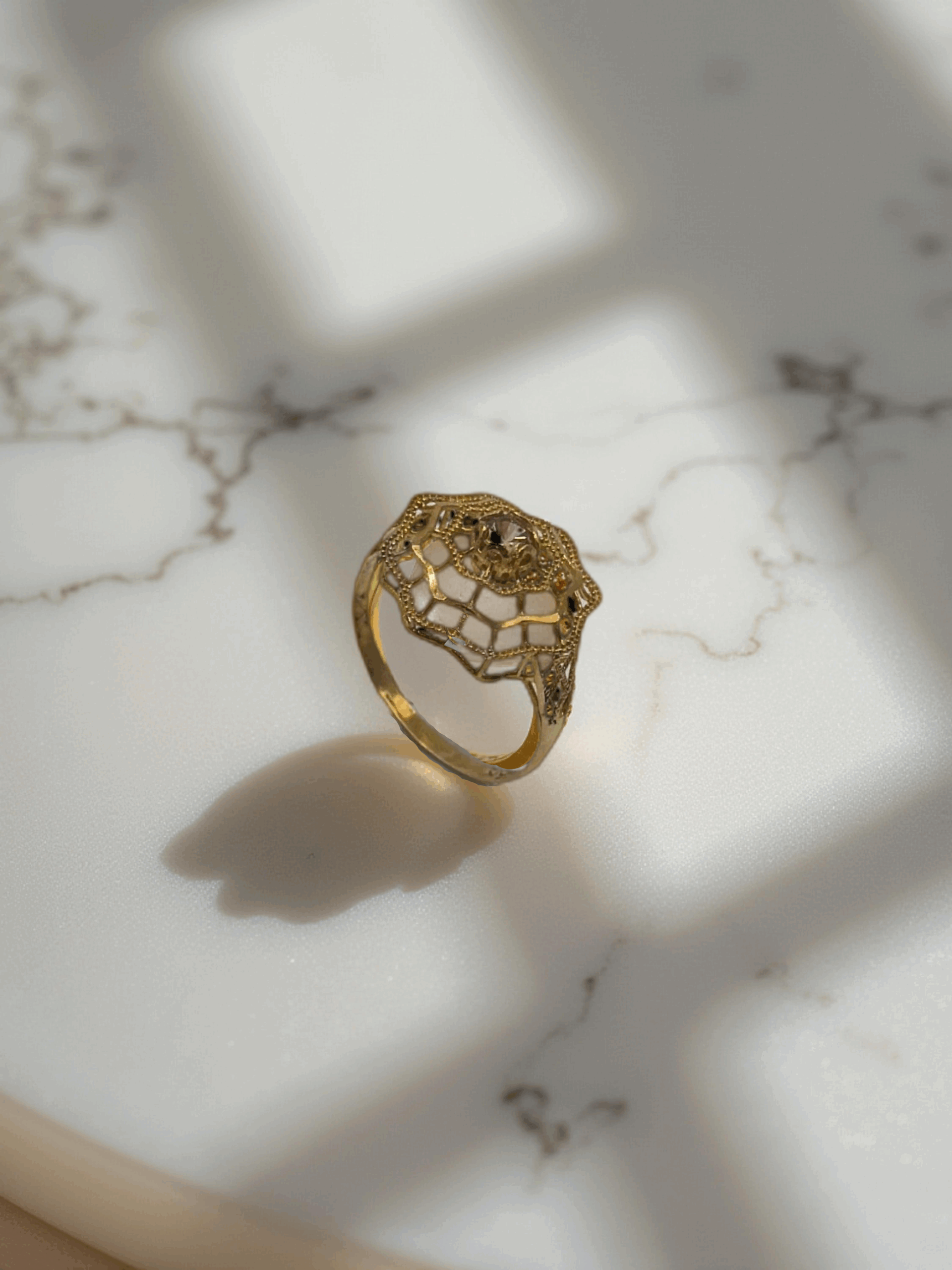 The Golden Mirage Ring is a fine blend of elegance and simplicity. Its subtle floral detailing adds a graceful touch, making it suitable for everyday wear as well as special events.