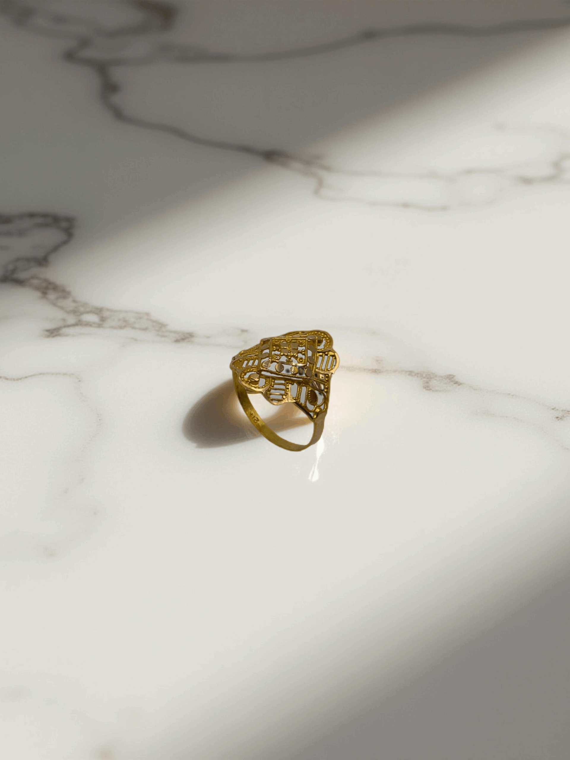 SKU: QZ-R13 Weight: 2.74g Purity: 21k The Golden Mosaic Ring is a fine blend of elegance and simplicity. Its subtle floral detailing adds a graceful touch, making it suitable for everyday wear as well as special events.