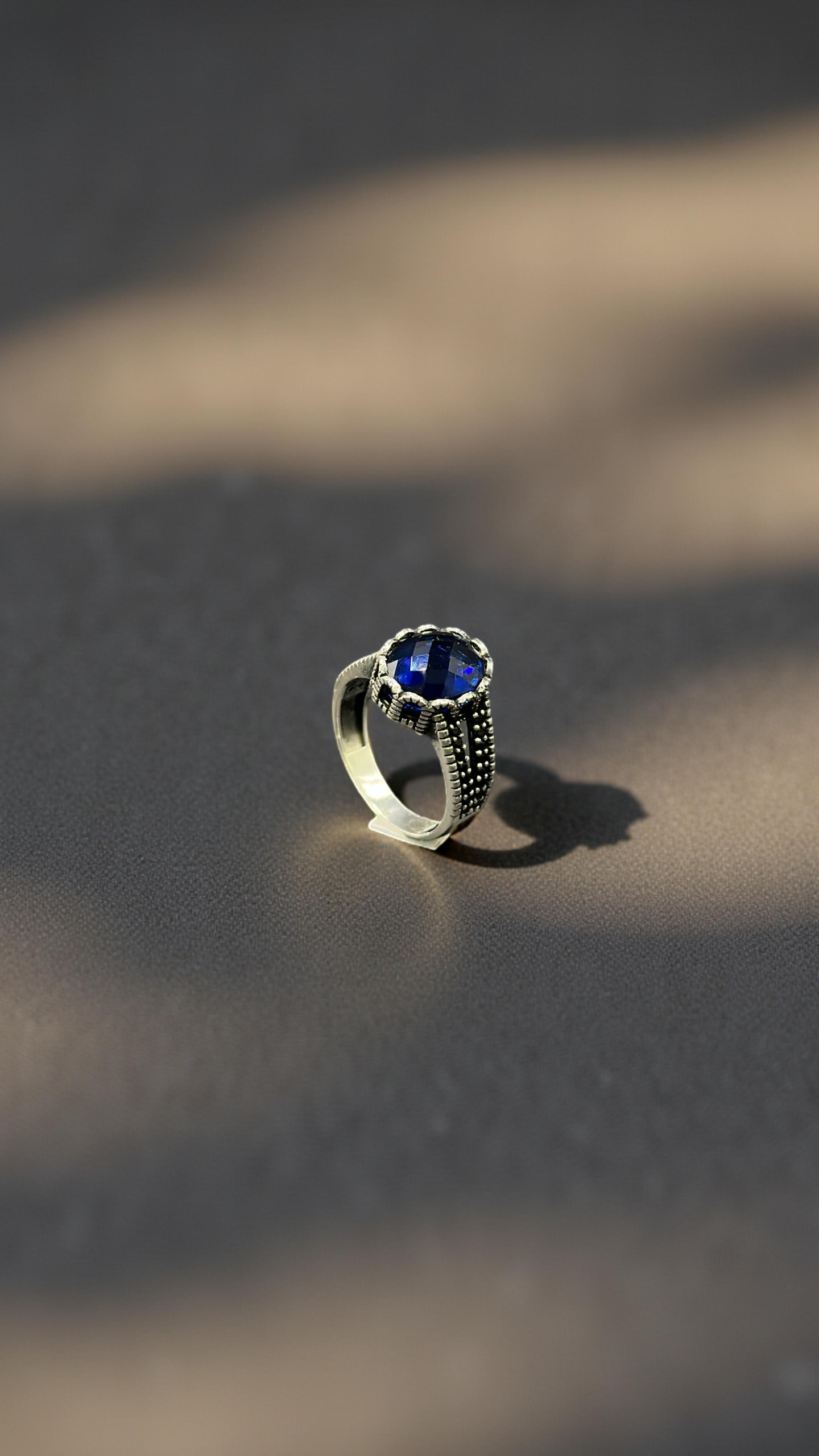 A regal silver ring crowned with a deep sapphire gem, radiating timeless elegance and bold sophistication.