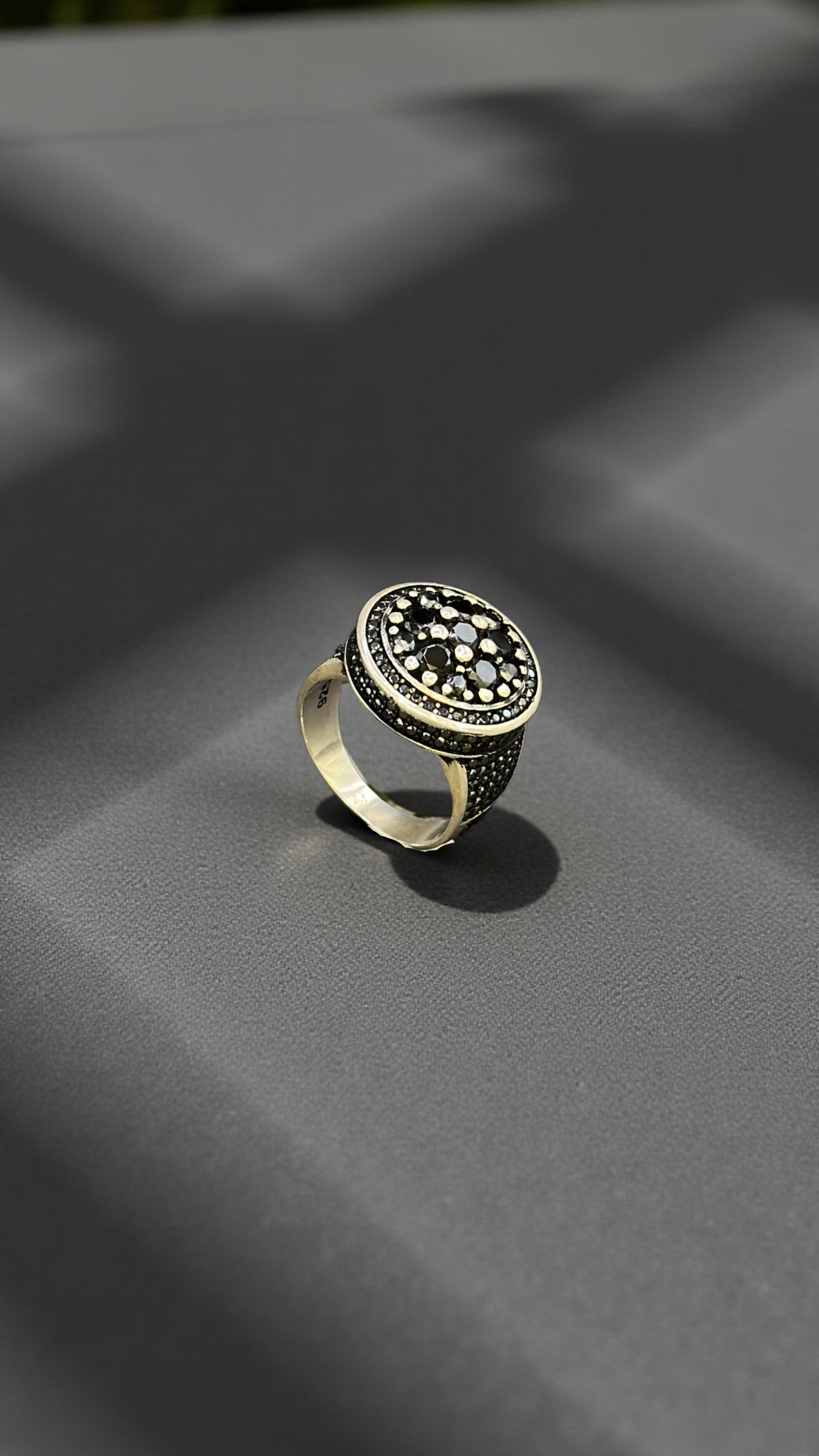 A striking silver ring adorned with shimmering black and white stones, embodying elegance and mystique.