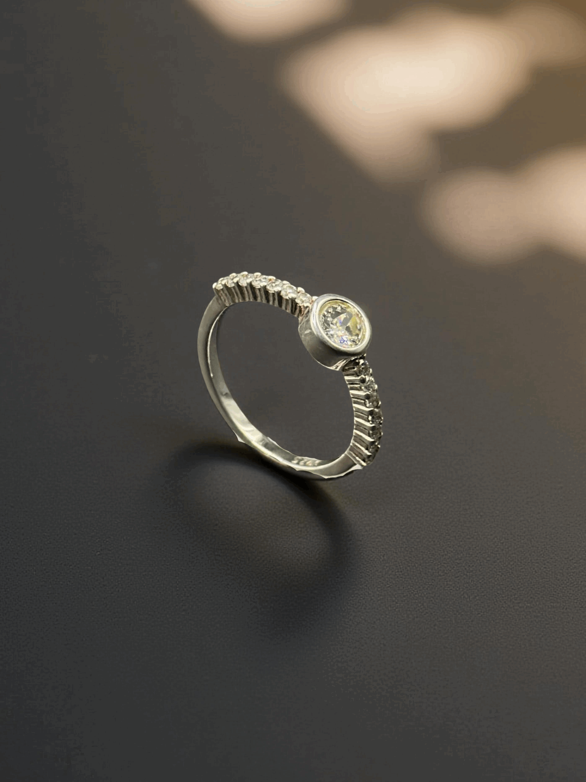SKU: QZ-SR45 Weight: 2.65g Purity: 925 A refined bezel-set ring featuring a brilliant center stone and a delicately sculpted band of diamonds, designed for effortless elegance.