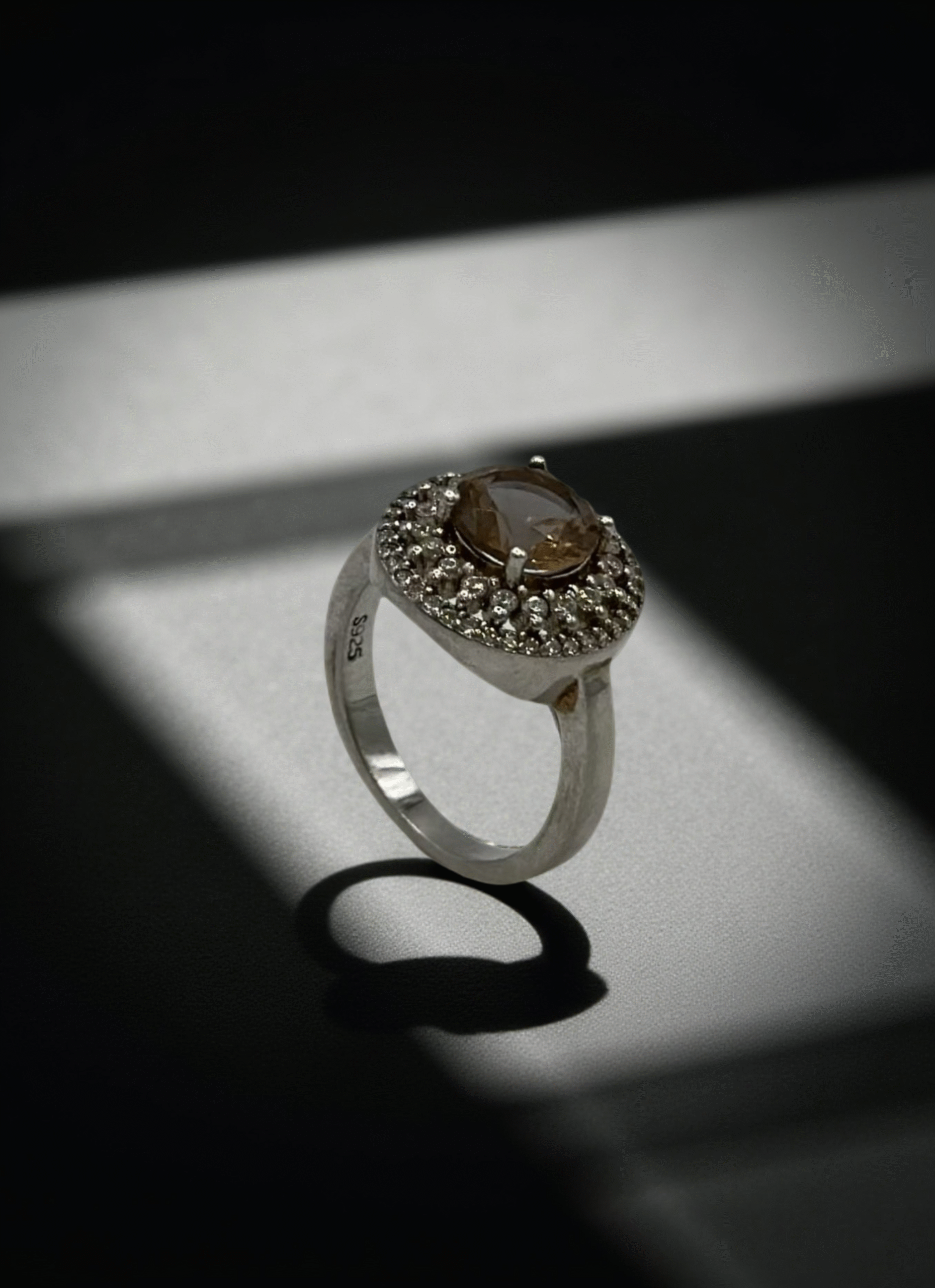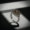 A stunning sterling silver ring featuring a central smoky quartz gemstone surrounded by a sparkling halo of smaller stones for a luxurious and elegant look.