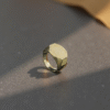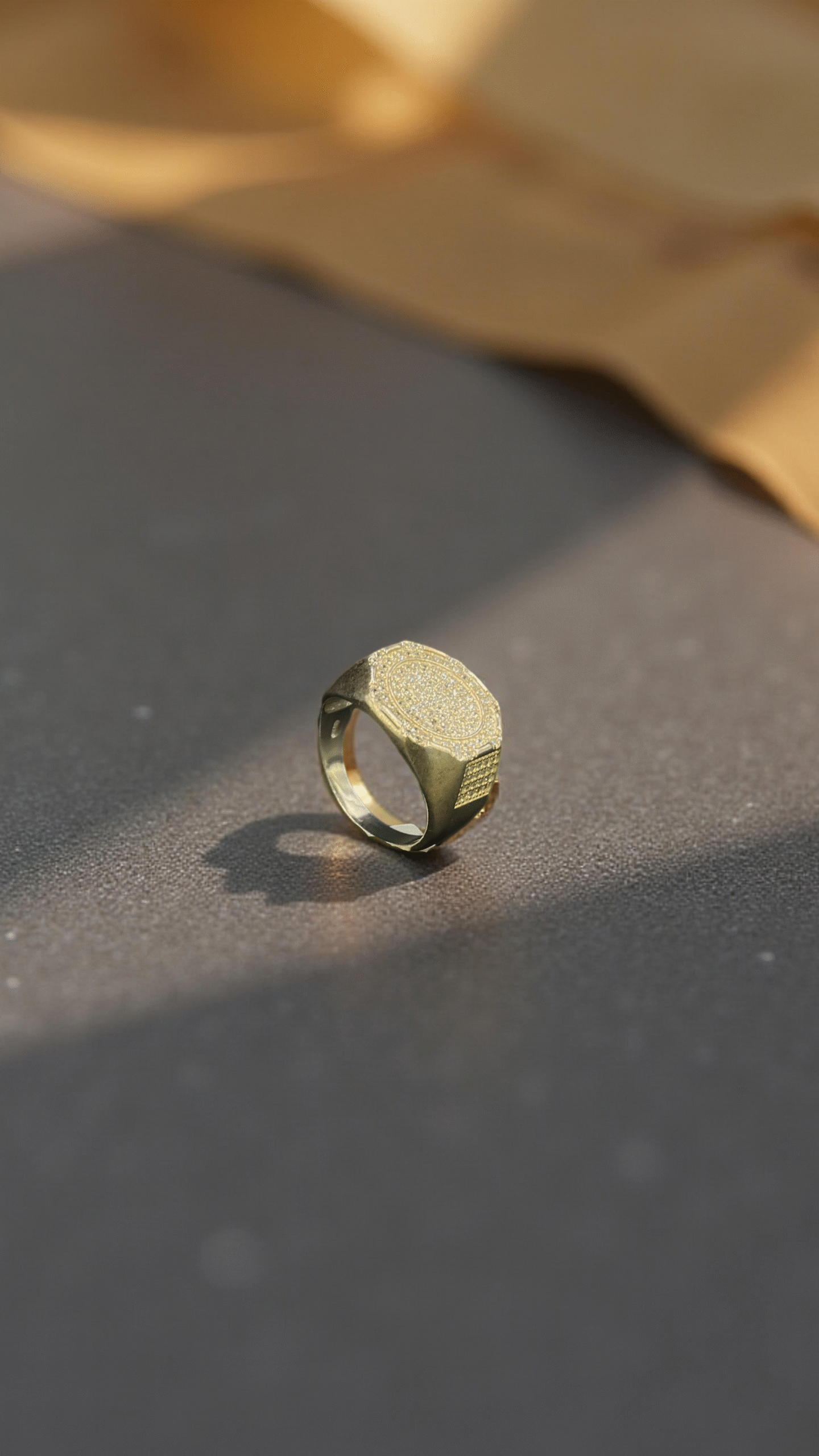A bold silver ring with a textured top surface that captures light like sunlight on stone, radiating quiet strength and elegance.