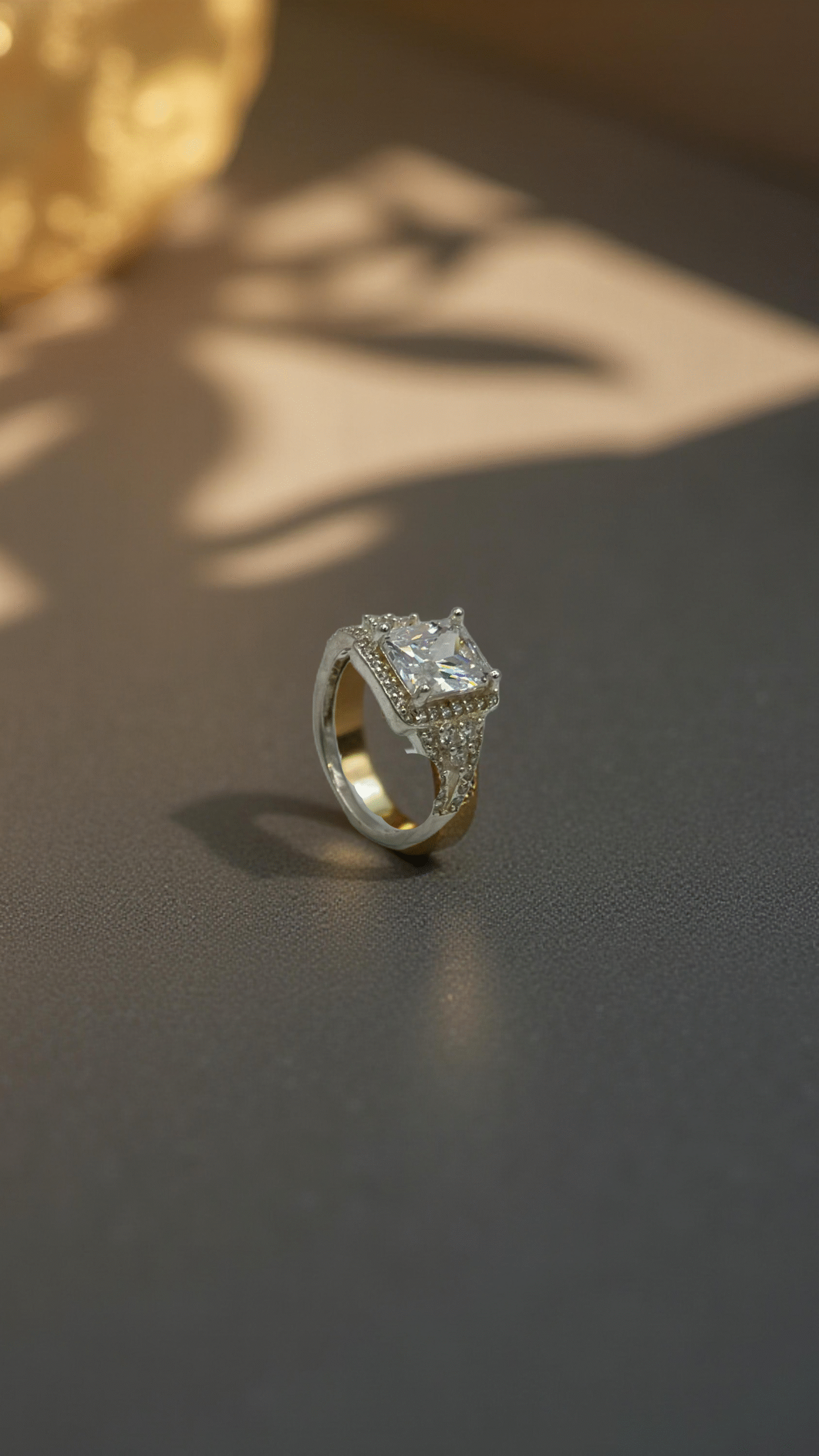 A sterling silver ring showcasing a large princess-cut centerpiece, framed by intricate pavé-set stones for a luxurious, regal finish.