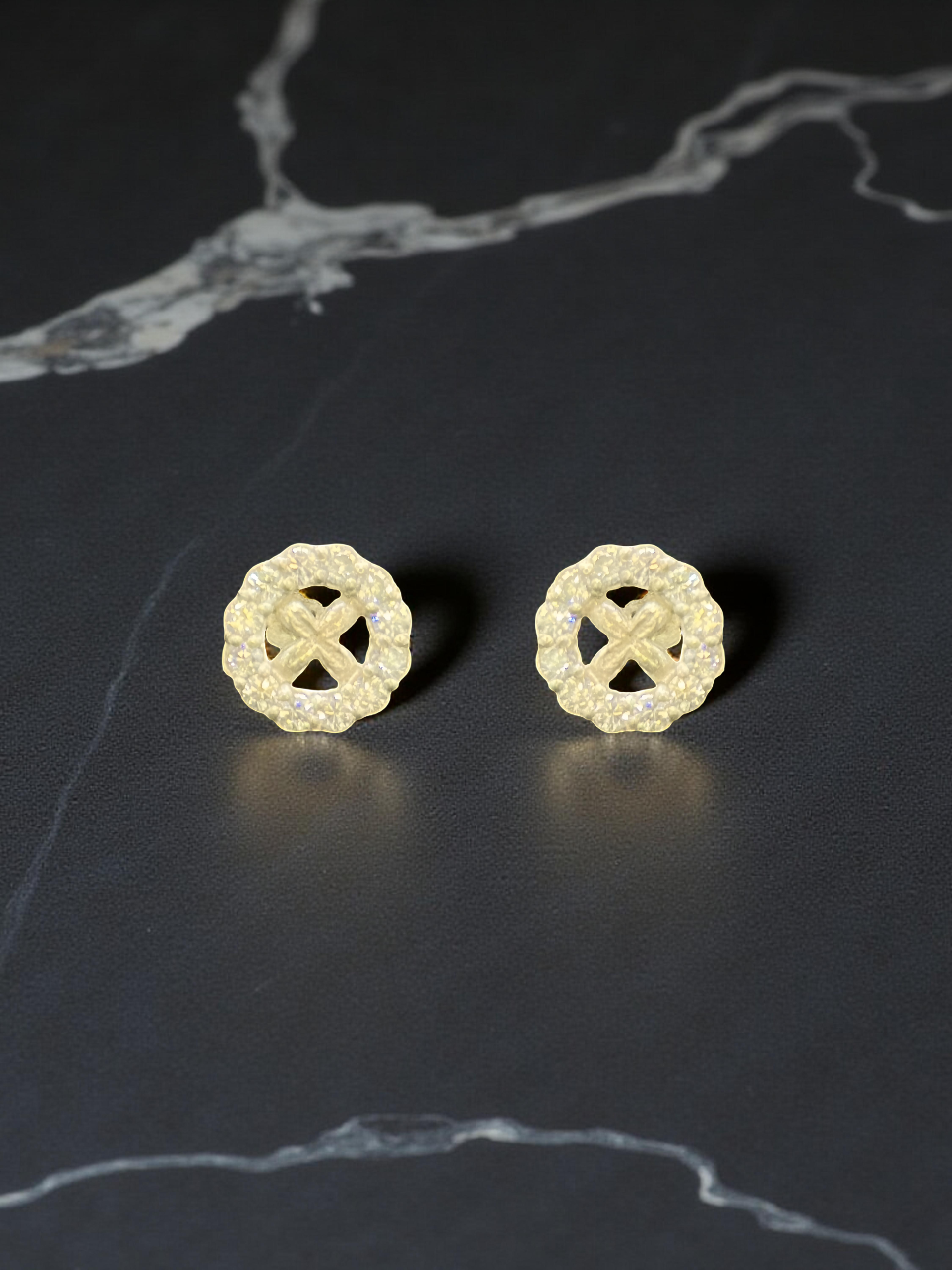 SKU: QZ-ST04 Weight: 1.1g Purity: 925 Elegant silver stud earrings featuring a textured circular design with a cut-out “X” pattern in the center, perfect for adding a subtle yet stylish touch to any outfit.