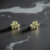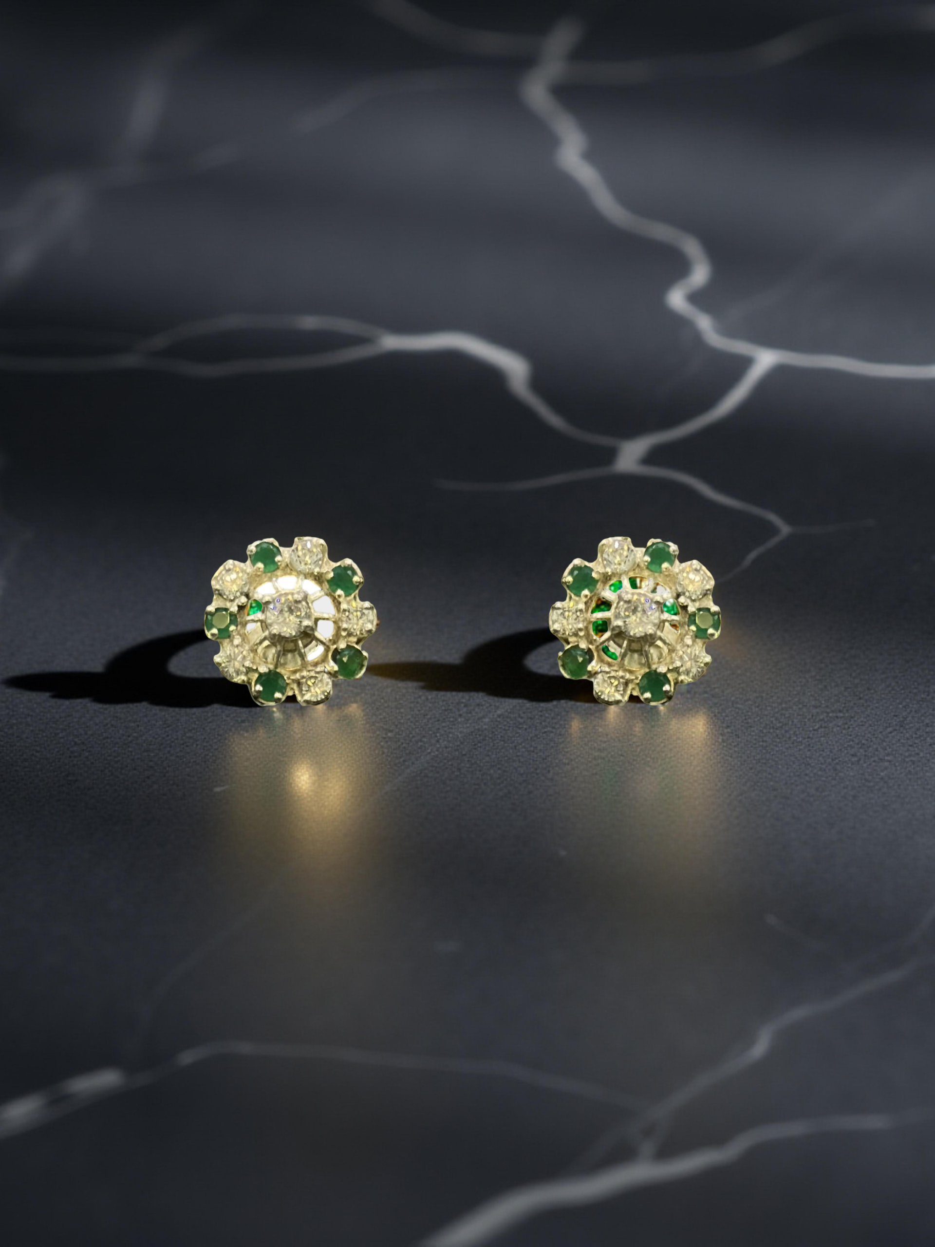 SKU: QZ-ST32 Weight: 1.3g Purity: 925 Dainty gold studs featuring a radiant floral design with shimmering diamonds and vivid emerald accents.