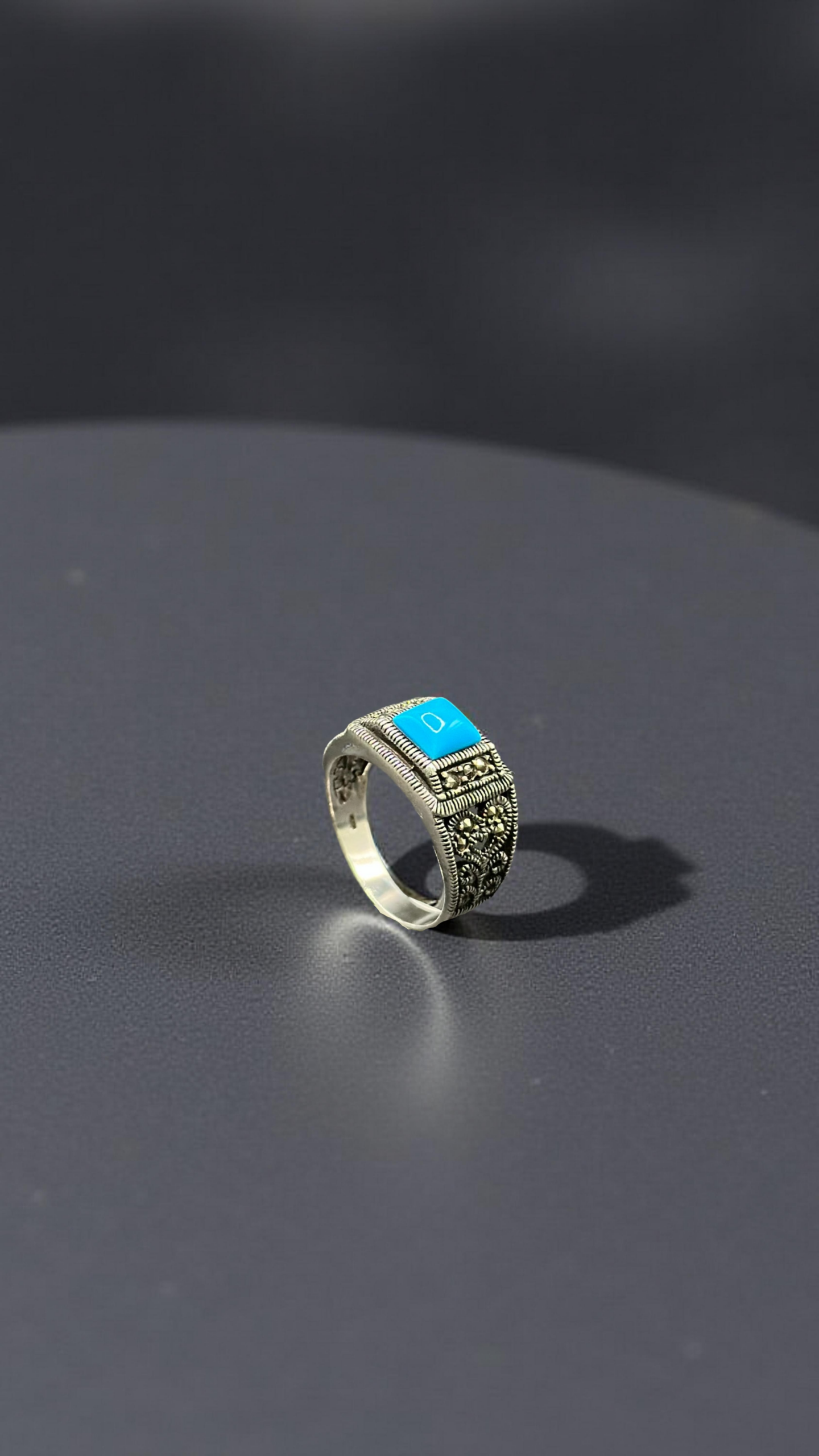 SKU: QZ-SR117 Weight: 6.12g Purity: 925 The Azure Sentinel Ring showcases a radiant turquoise-blue stone engraved with a subtle symbol, set atop a band of vintage-inspired silver filigree.