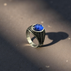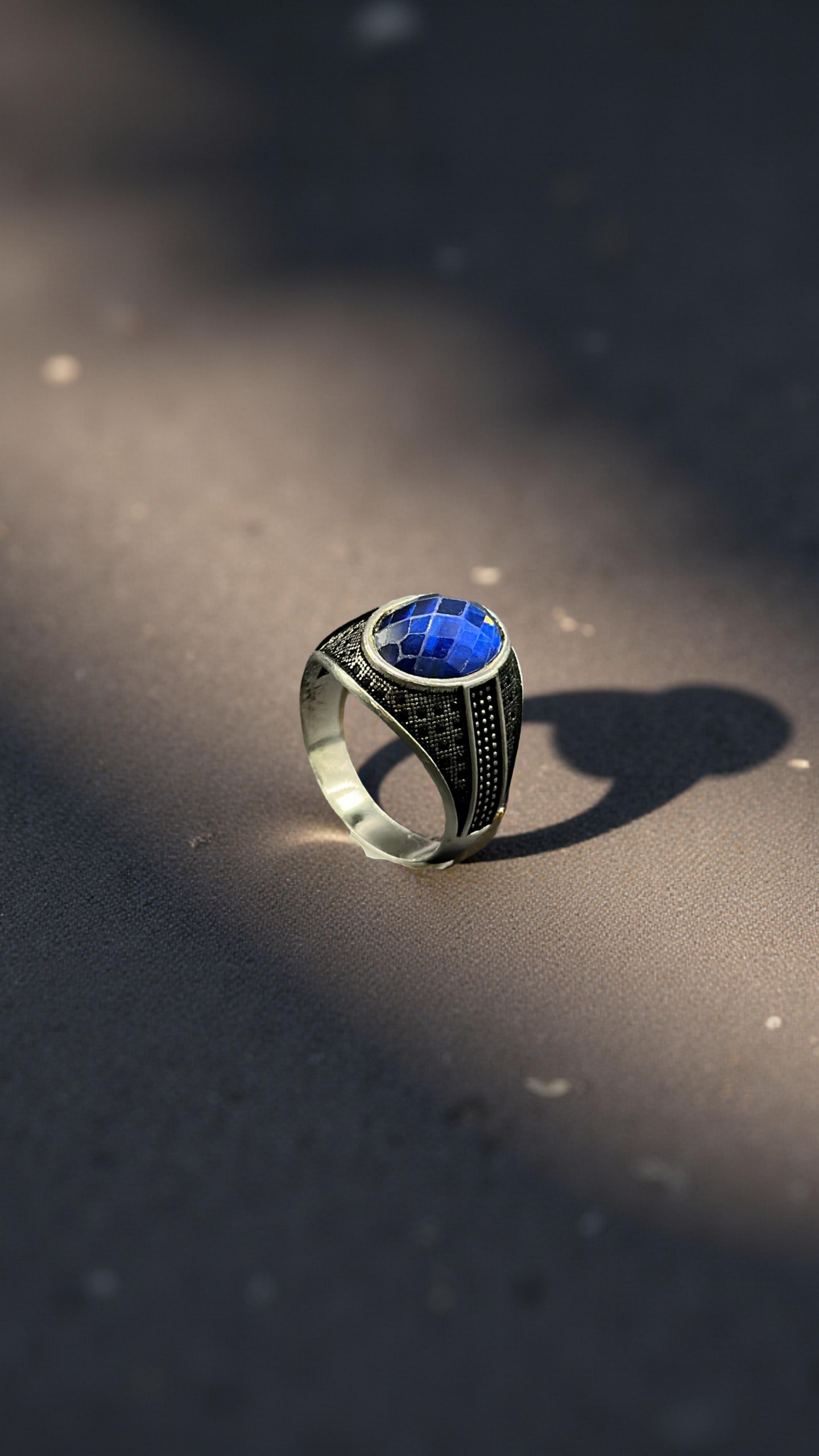 SKU: QZ-SR123 Weight: 7.77g Purity: 925 A regal silver ring featuring a faceted deep blue stone, echoing the mysteries of the night sky.