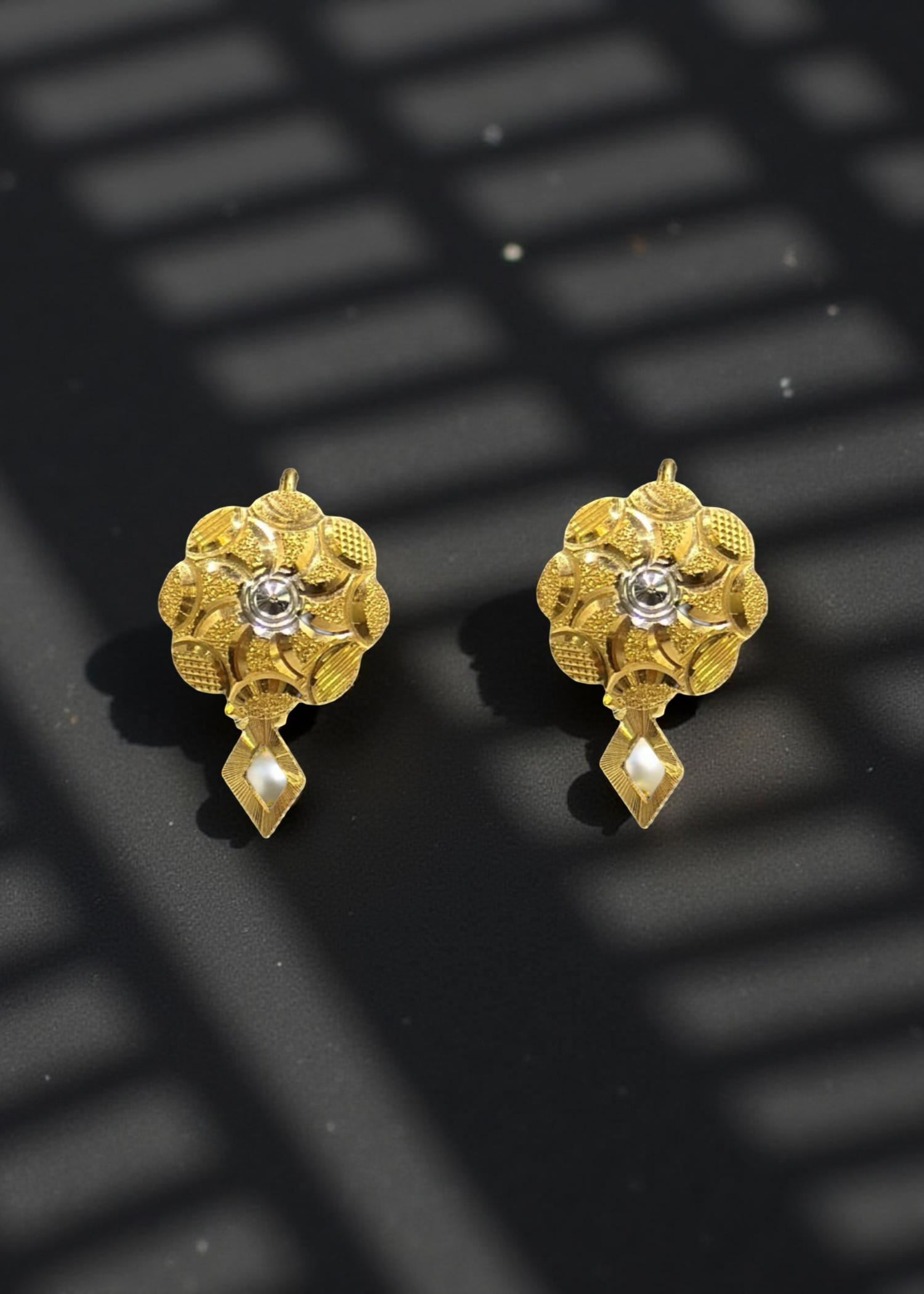 SKU: QZ-ER22 Weight: 1.82g Purity: 21k The Bloom Pearl earrings feature a golden floral design cradling a luminous pearl, blending timeless elegance with delicate charm for any occasion.