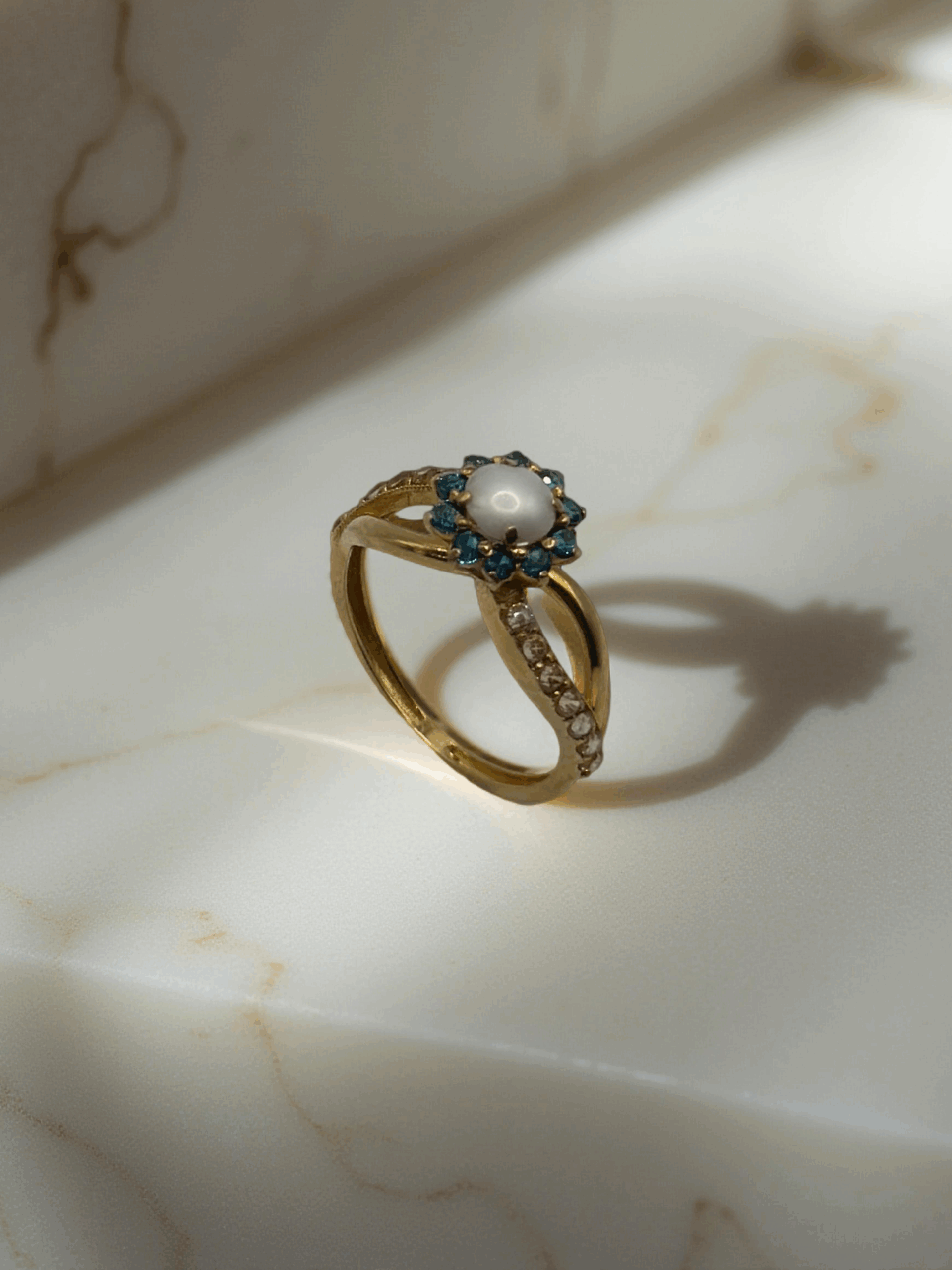 SKU: QZ-R47 Weight: 2.68g Purity: 21k The Blue Floral Accent Ring is a fine blend of elegance and simplicity. Its subtle floral detailing adds a graceful touch, making it suitable for everyday wear as well as special events