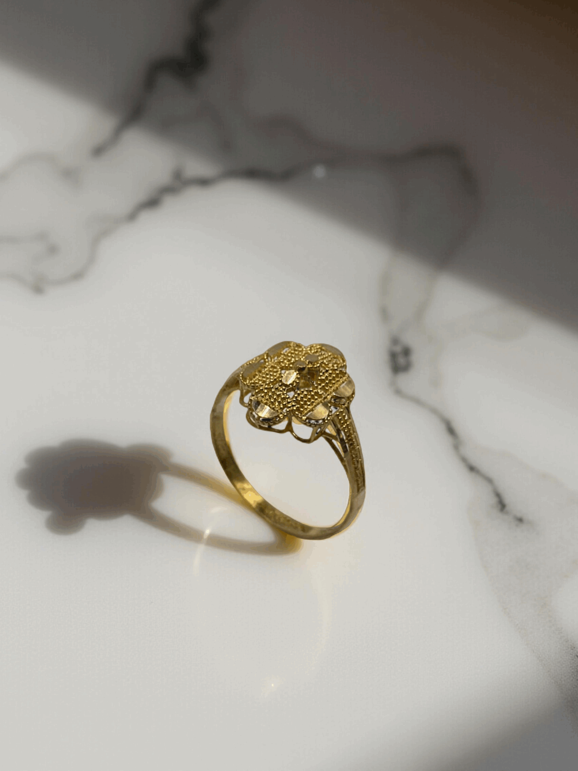 SKU: QZ-R39 Weight: 2.13g Purity: 21k The Classic Domed Ring is a fine blend of elegance and simplicity. Its subtle floral detailing adds a graceful touch, making it suitable for everyday wear as well as special events.