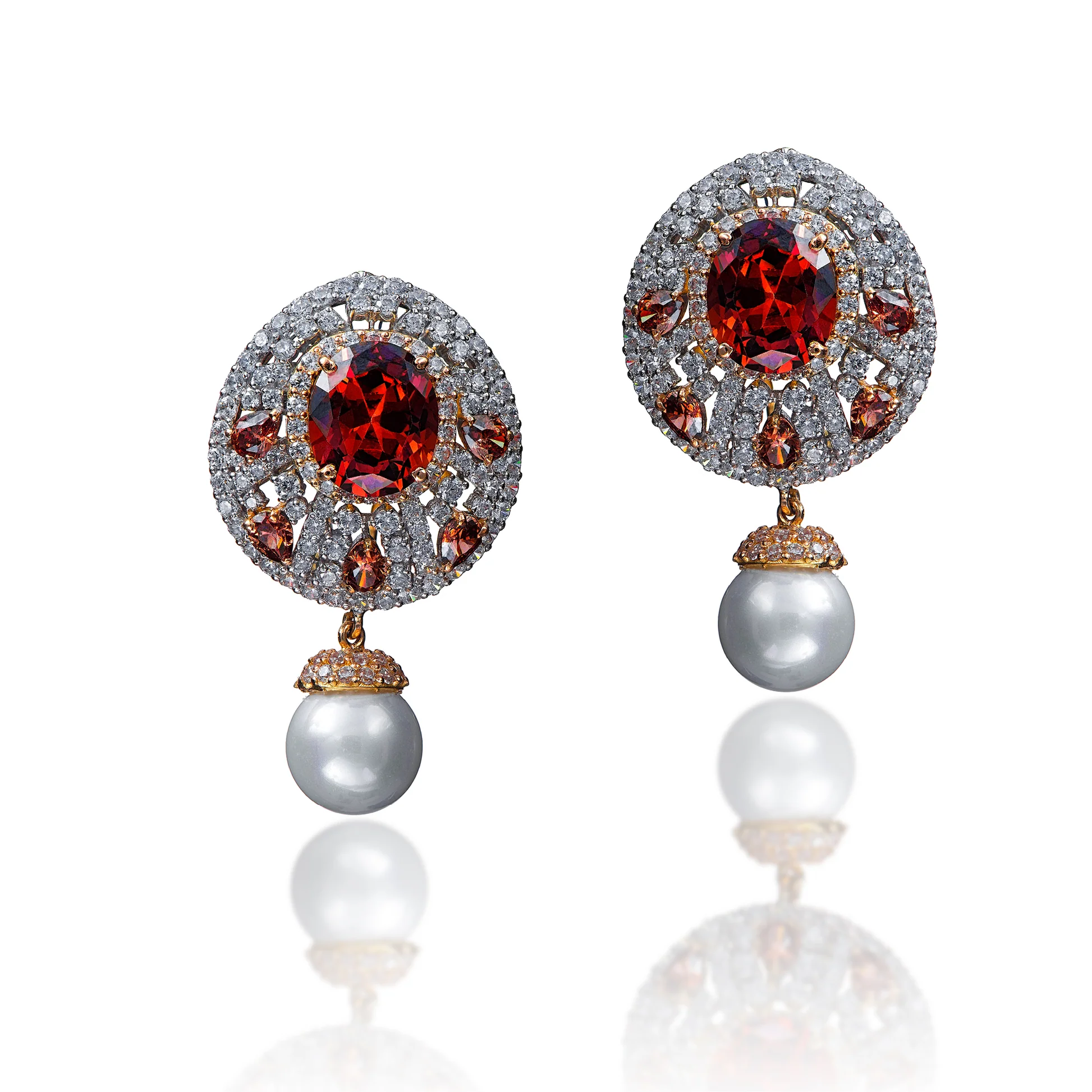 SKU: QZ-ER36 Weight: 27.12g Purity: 21k Regal earrings featuring a fiery red gemstone centerpiece, encircled by radiant diamonds and crowned with lustrous pearl drops.