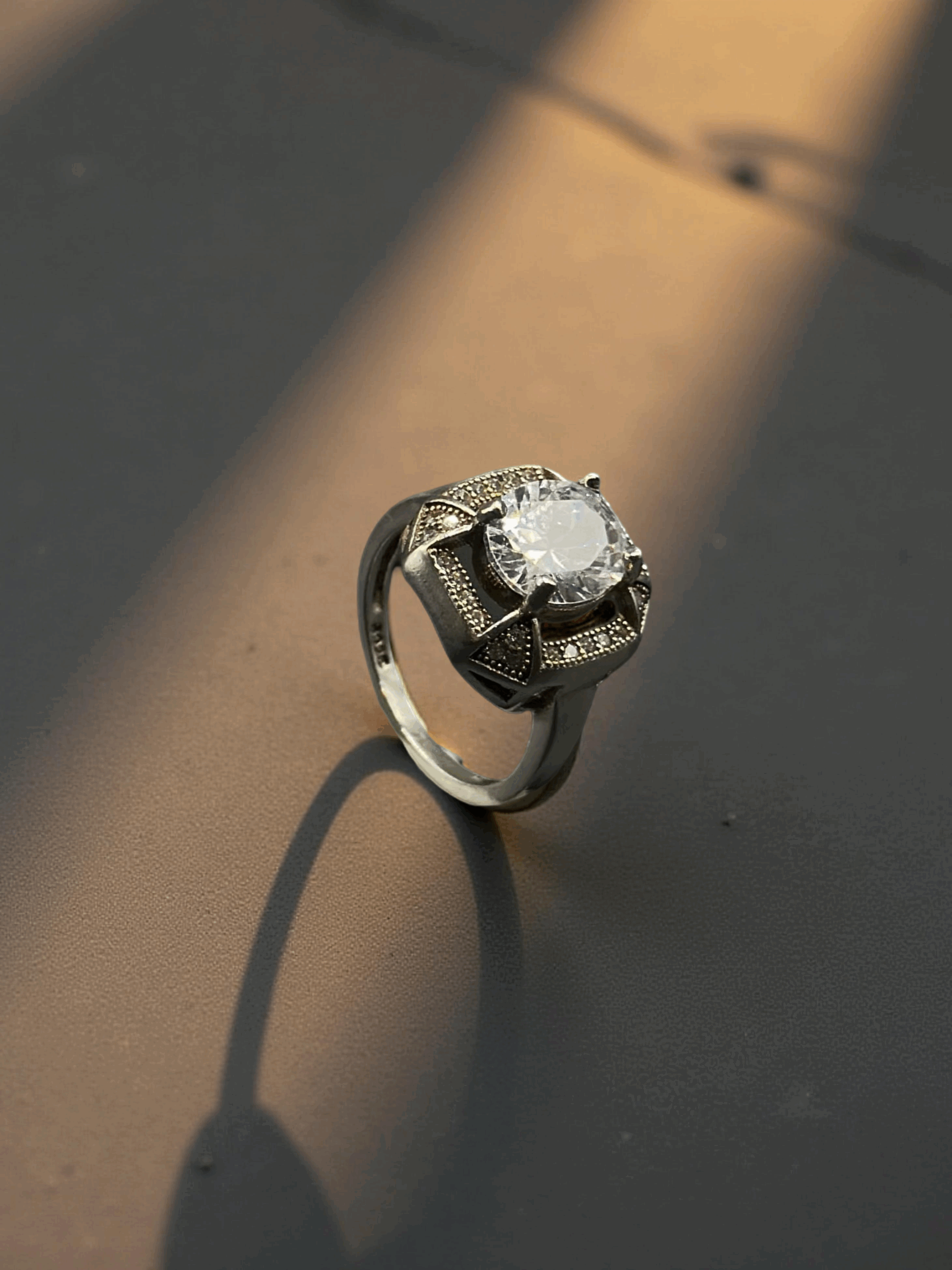 SKU: QZ-SR09 Weight: 4.52g Purity: 925 A bold and radiant ring encircled by a luminous halo, embodying the strength and commanding presence of a true domina.