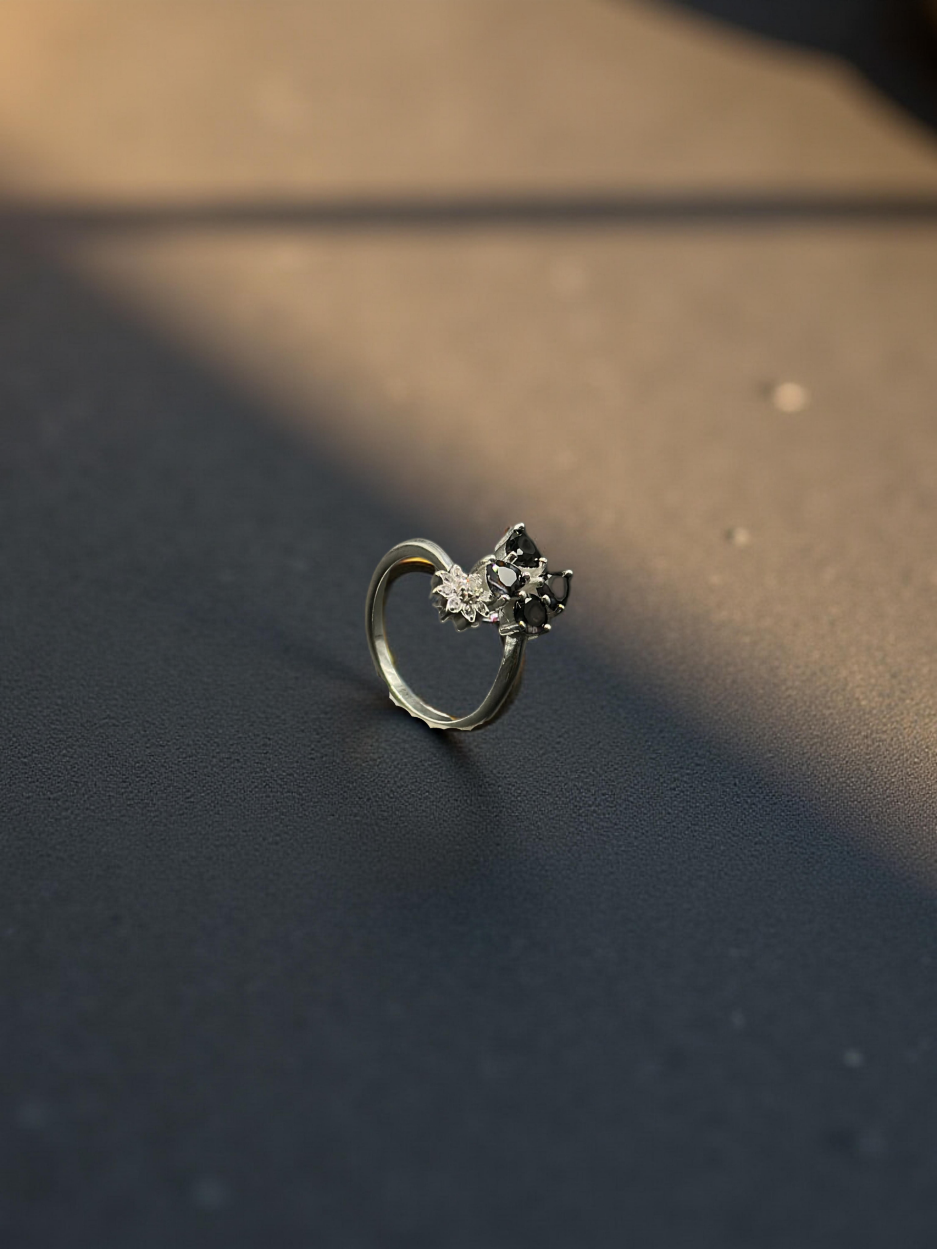 SKU: QZ-SR81 Weight: 2.74g Purity: 925 A graceful silver band featuring a striking contrast of black and white stones, symbolizing the harmony of shadow and light.