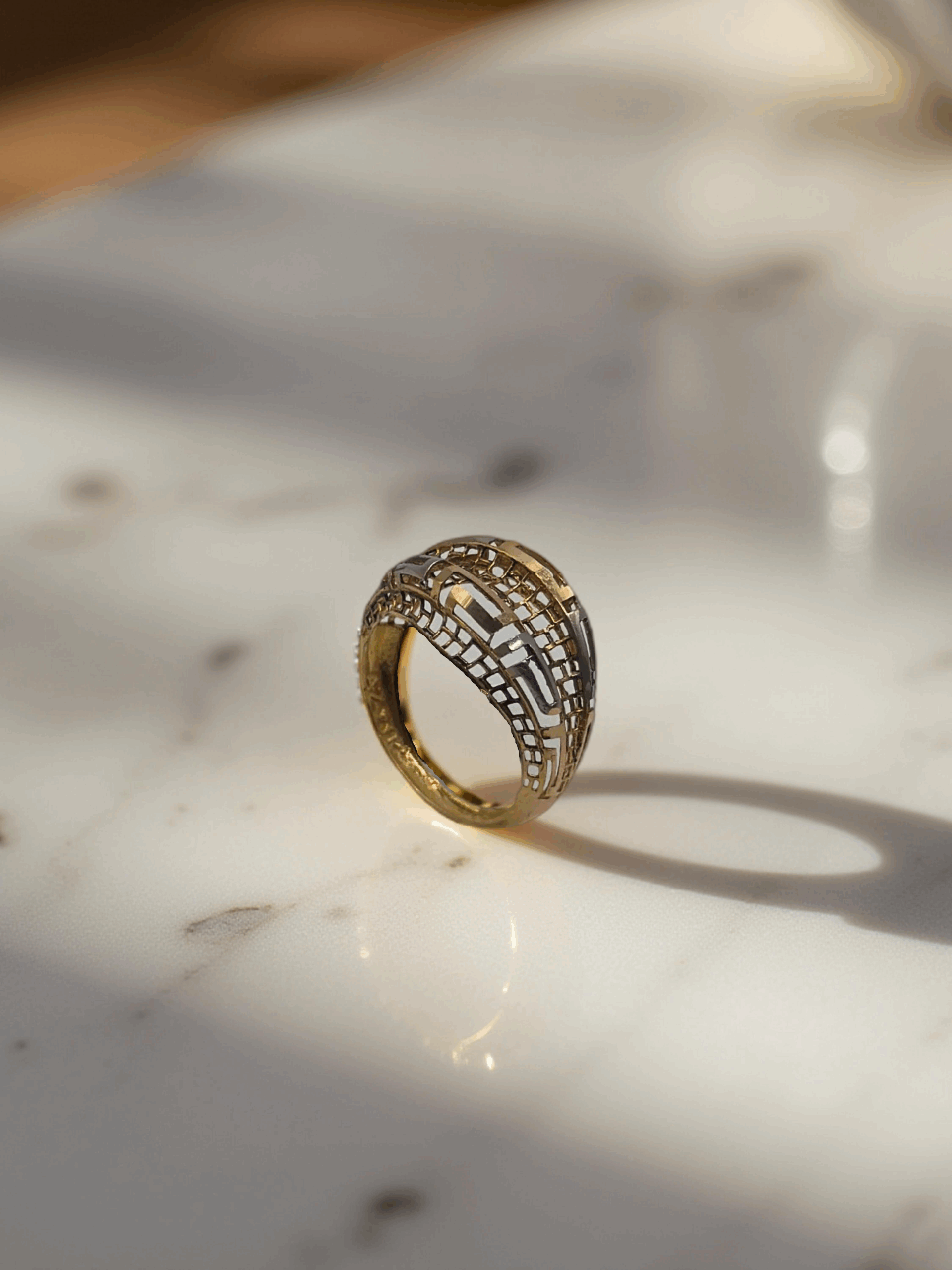 SKU: QZ-R25 Weight: 2.48g Purity: 21k The Eclipse Royale Ring is a fine blend of elegance and simplicity. Its subtle floral detailing adds a graceful touch, making it suitable for everyday wear as well as special events.