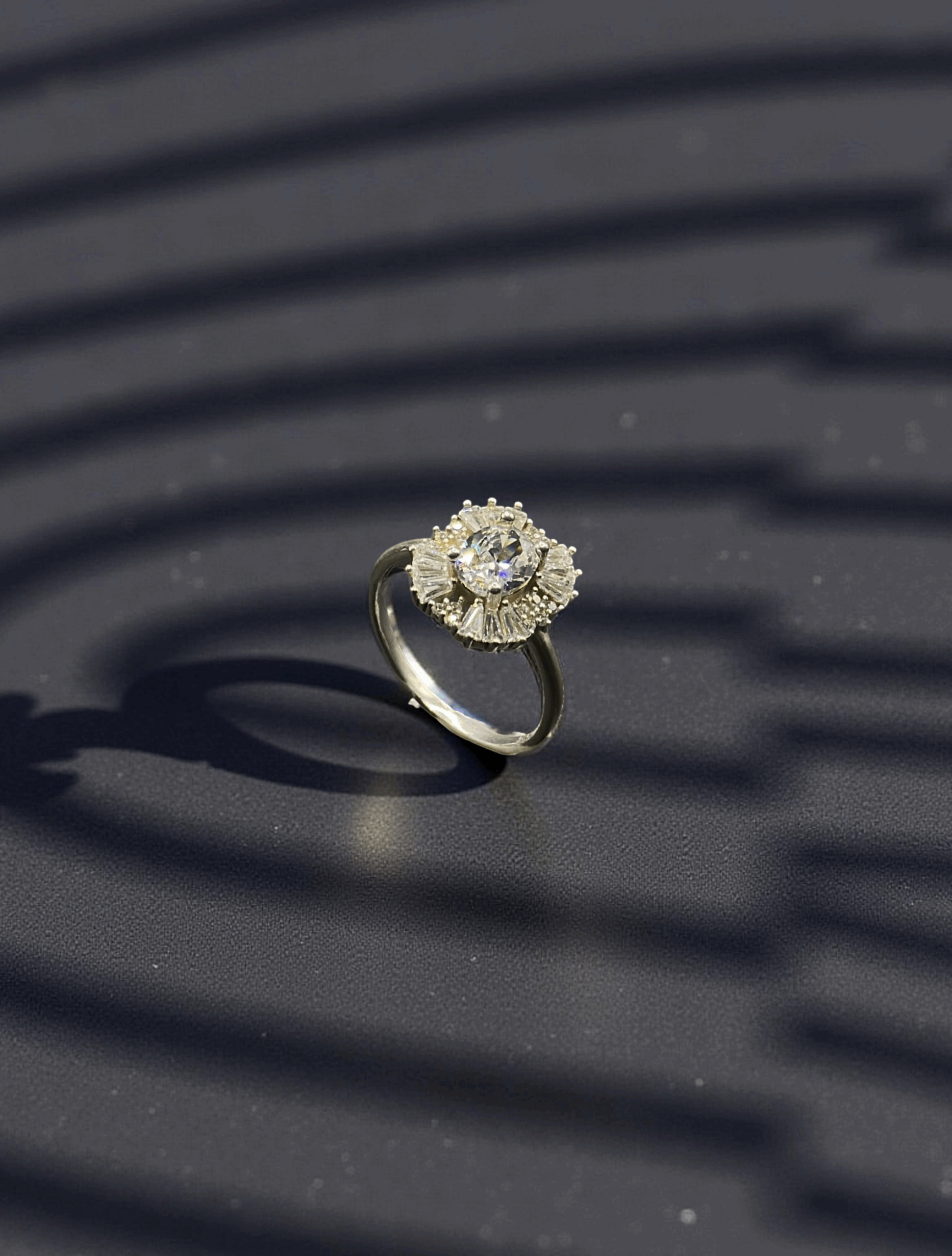 SKU: QZ-SR14 Weight: 3.22g Purity: 925 A stunning halo ring featuring a central round diamond surrounded by baguette diamonds, set in a classic band for a timeless, elegant look.