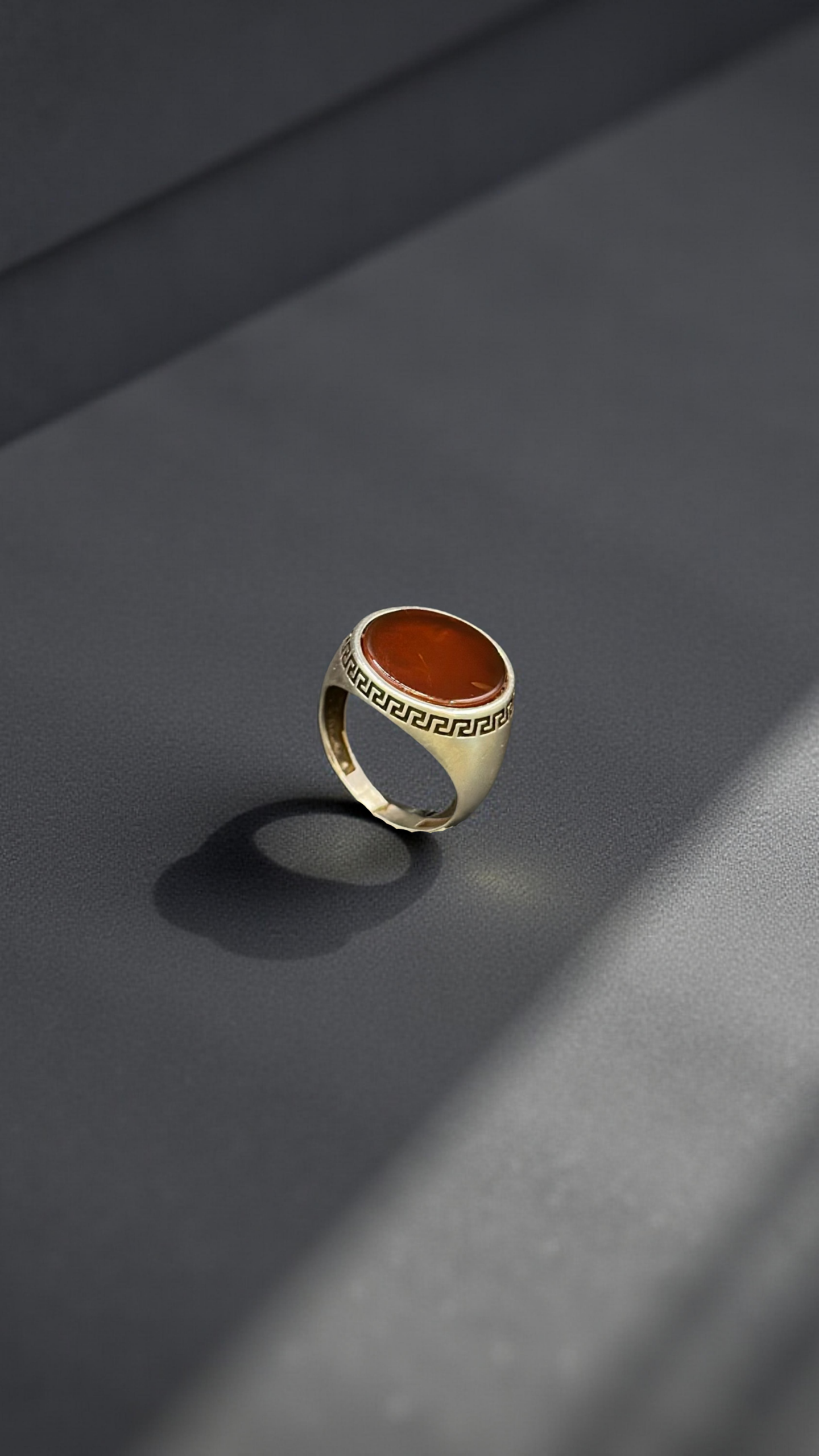 SKU: QZ-SR145 Weight: 6.52g Purity: 925 A bold gold ring featuring a polished amber stone, framed with an elegant Greek key design for a timeless look.