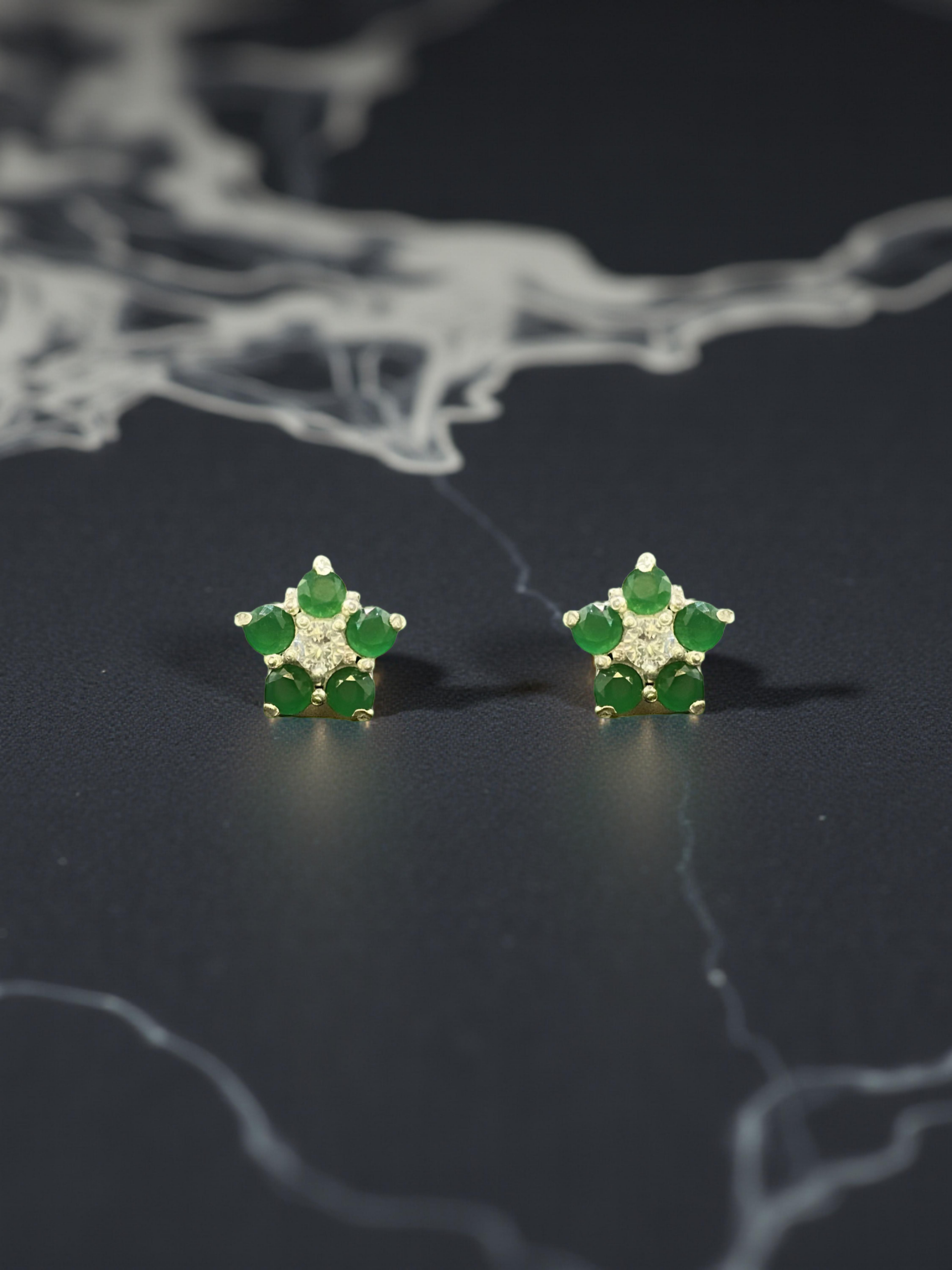 SKU: QZ-ST30 Weight: 1.37g Purity: 925 Delicate floral studs adorned with vivid green stones and a shimmering gold-tone finish, perfect for a fresh and elegant touch.