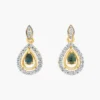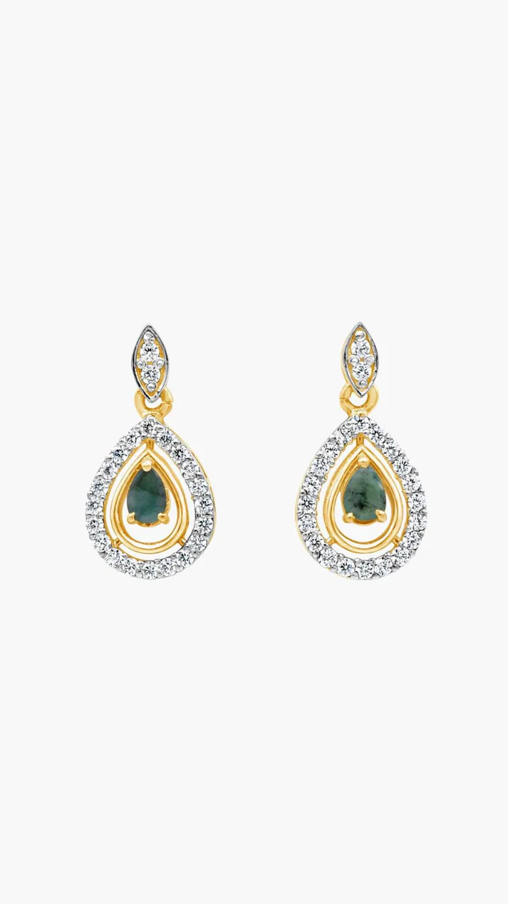 SKU: QZ-SER36 Weight: 6g Purity: 925 Graceful teardrop earrings showcasing deep green emerald centers, framed by concentric gold accents and shimmering diamond halos.