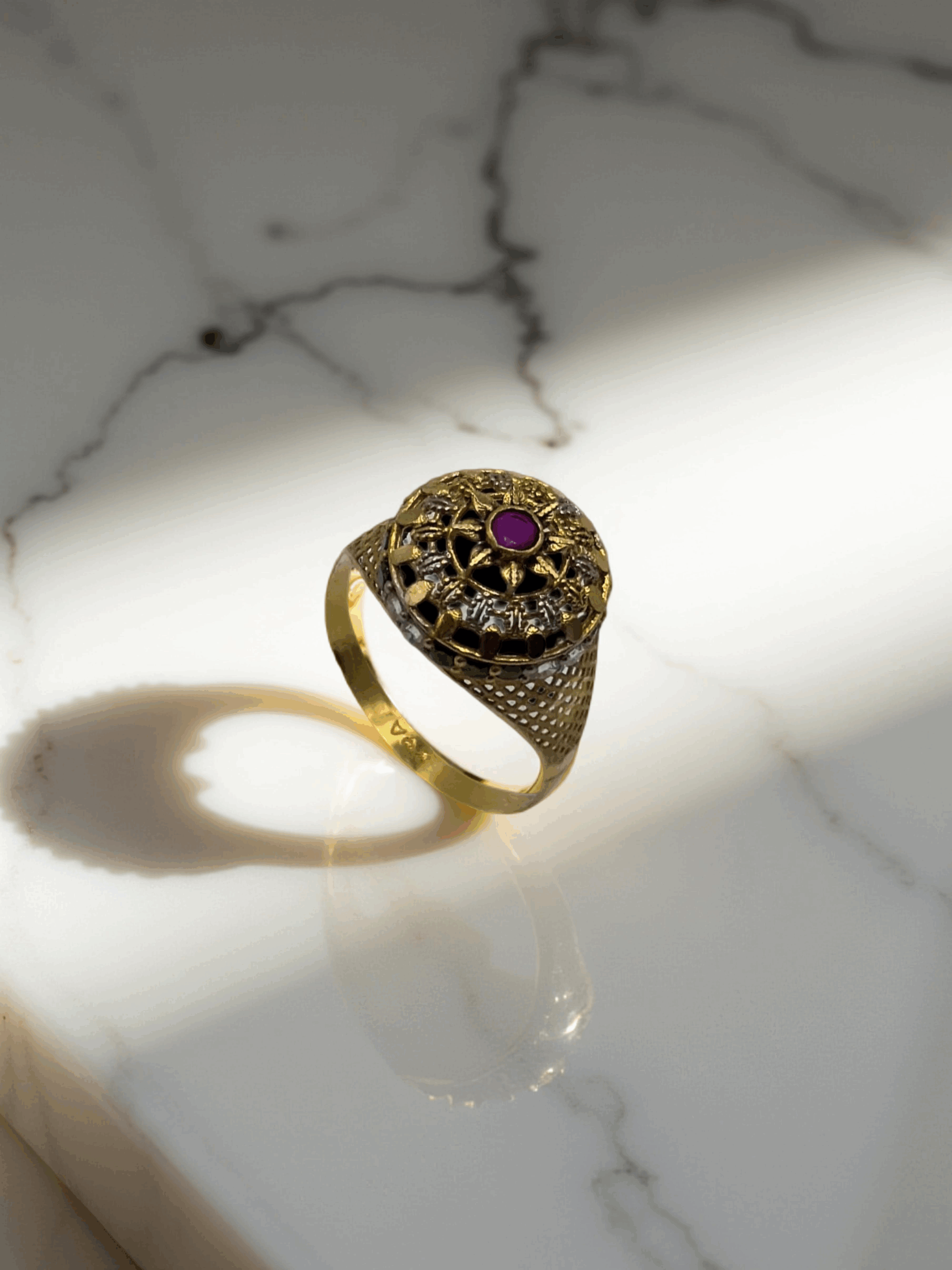 SKU: QZ-R49 Weight: 2.85g Purity: 21k The Gemspire Ring is a fine blend of elegance and simplicity. Its subtle floral detailing adds a graceful touch, making it suitable for everyday wear as well as special events.