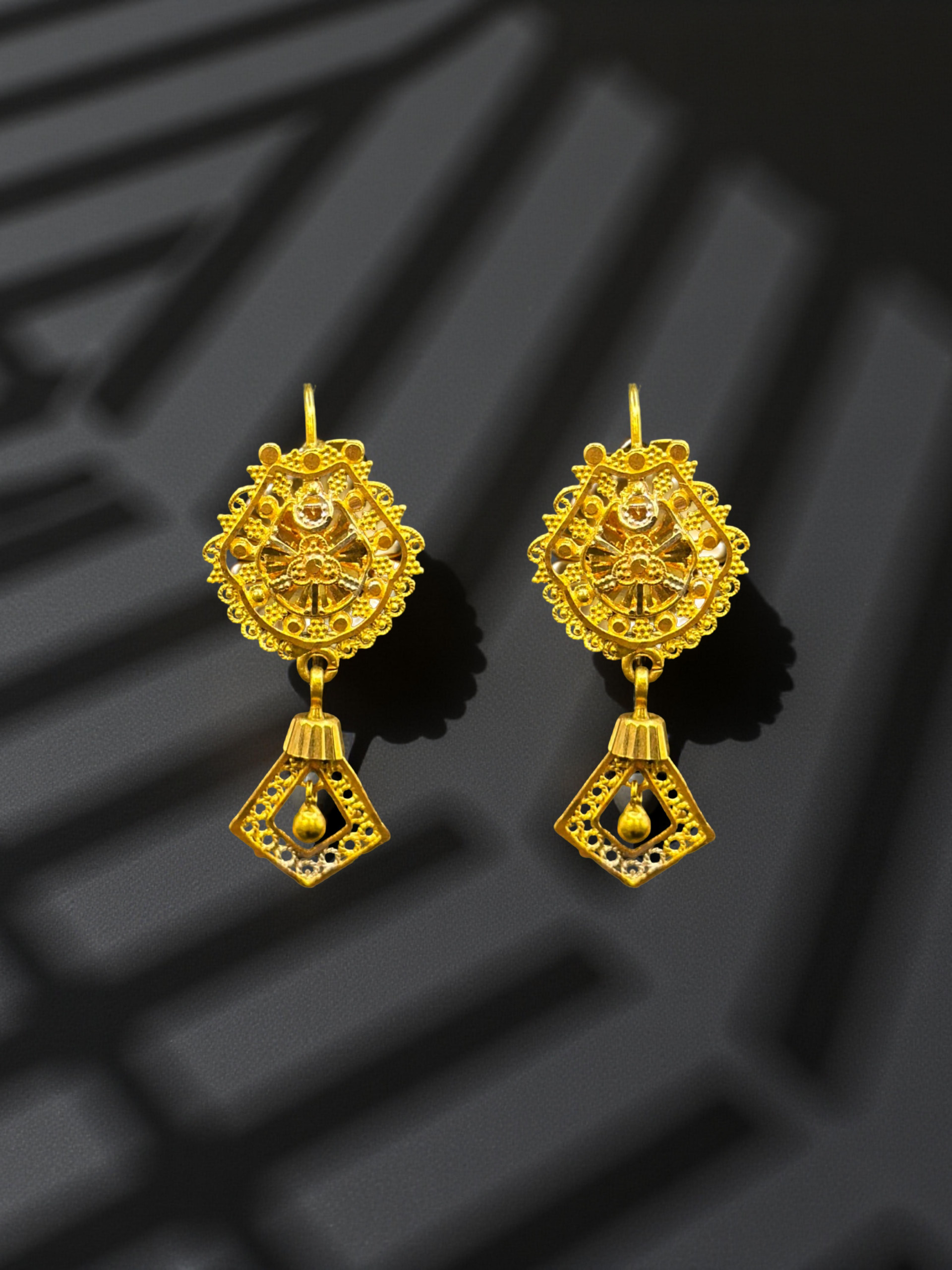 SKU: QZ-ER06 Weight: 4.36g Purity: 21k The Golden Lace Drops feature intricate lace filigree and teardrop-shaped dangles, offering a blend of refined beauty and graceful movement in a radiant gold finish.