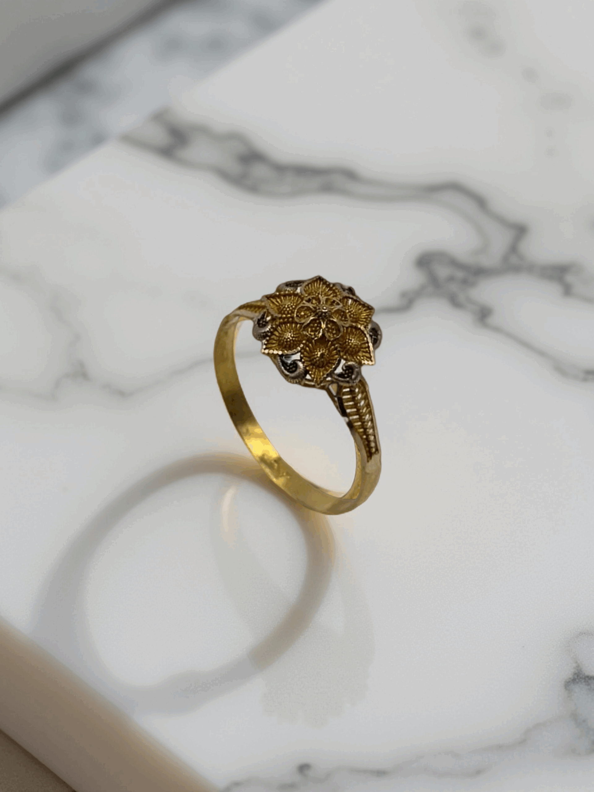 SKU: QZ-R35 Weight: 1.74g Purity: 21k The Heirloom Blossom Ring is a fine blend of elegance and simplicity. Its subtle floral detailing adds a graceful touch, making it suitable for everyday wear as well as special events.