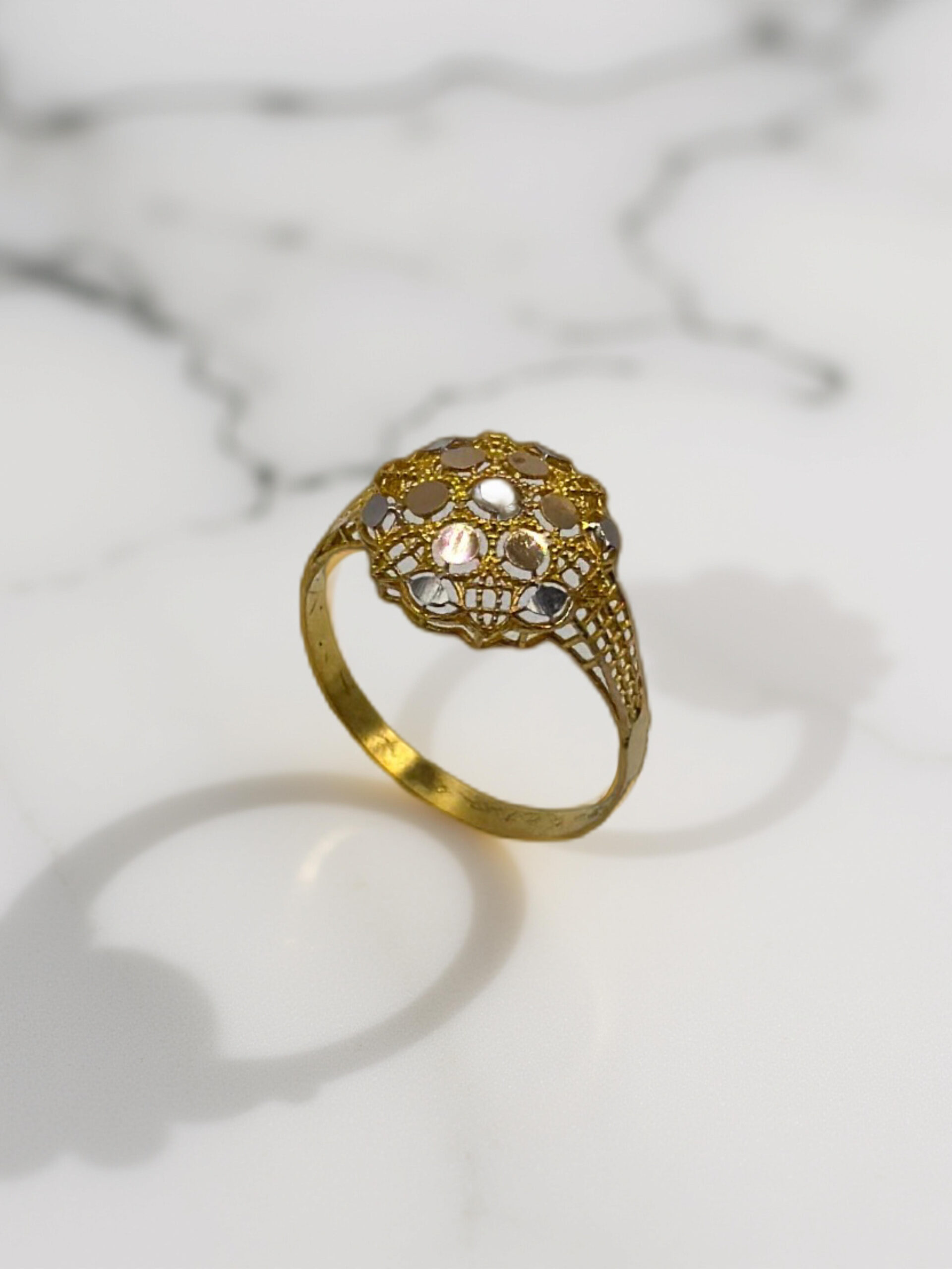 SKU: QZ-R40 Weight: 1.54g Purity: 21k The Heritage Spark Ring is a fine blend of elegance and simplicity. Its subtle floral detailing adds a graceful touch, making it suitable for everyday wear as well as special events.
