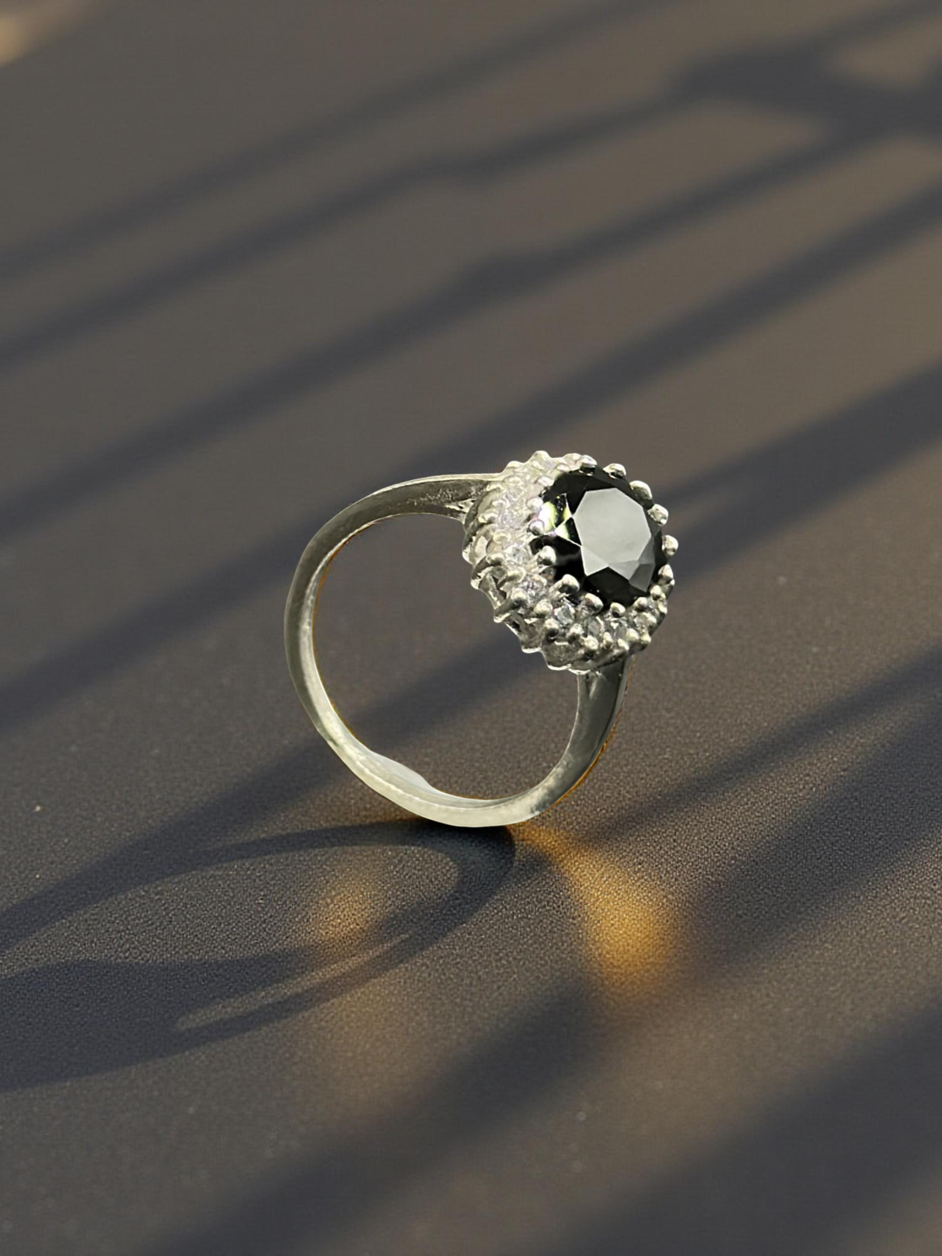 SKU: QZ-SR80 Weight: 3.55g Purity: 925 A beautifully crafted ring showcasing a black gem at its heart, glowing like twilight beneath a starlit sky.