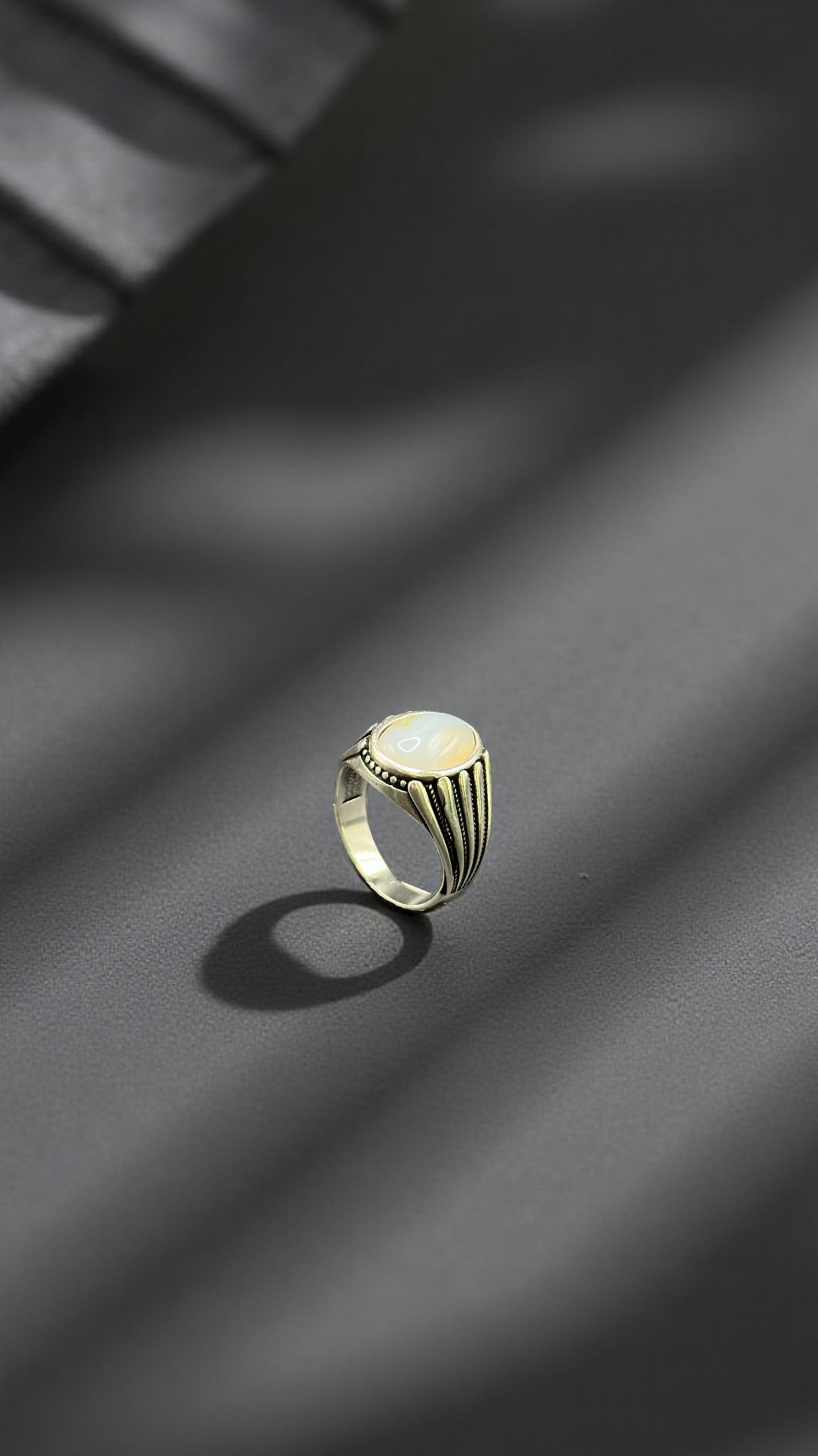SKU: QZ-SR114 Weight: 7.9g Purity: 925 A vintage-inspired silver ring crowned with a glowing moonstone for a celestial touch of elegance.