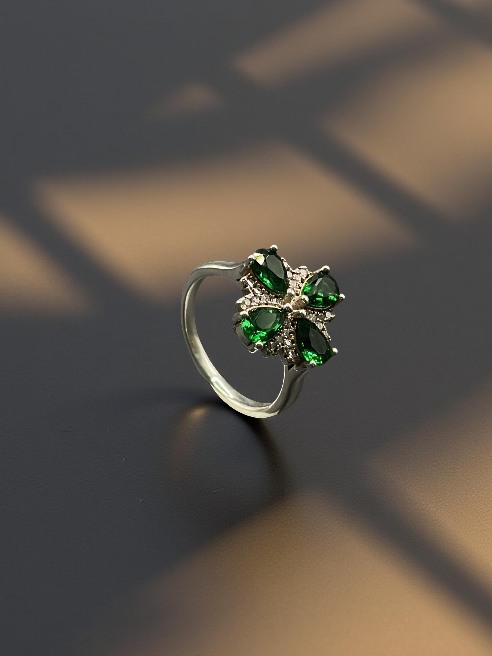 SKU: QZ-SR83 Weight: 3.88g Purity: 925 A stunning silver ring adorned with four vibrant pear-shaped green gemstones arranged like a clover, accented by small sparkling stones, casting a gentle shadow on a dark surface.