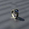 SKU: QZ-SR116 Weight: 6.47g Purity: 925 The Midnight Regent Ring is a bold and regal piece, featuring a deep-cut sapphire-blue gemstone set in an intricately detailed silver band.