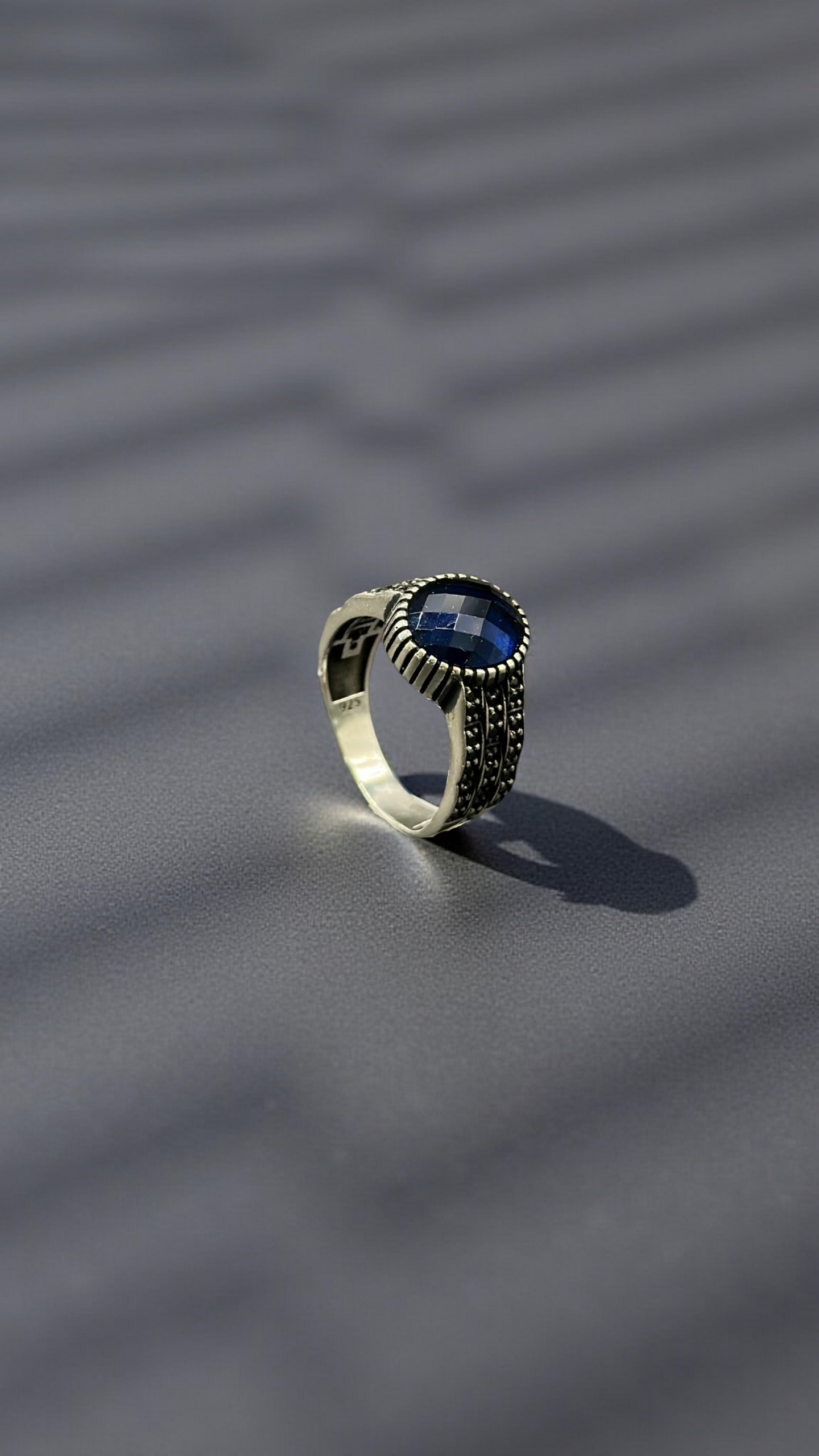 SKU: QZ-SR116 Weight: 6.47g Purity: 925 The Midnight Regent Ring is a bold and regal piece, featuring a deep-cut sapphire-blue gemstone set in an intricately detailed silver band.
