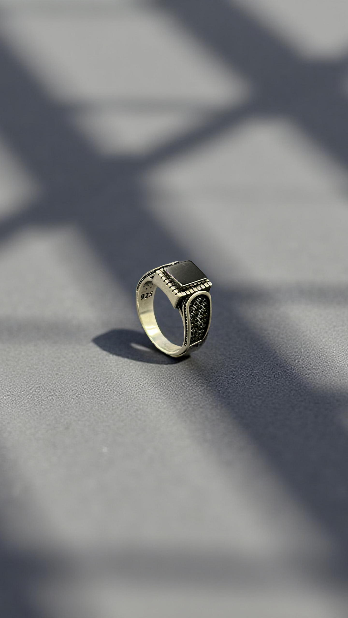 SKU: QZ-SR115 Weight: 8.22g Purity: 925 A bold sterling silver ring featuring a sleek black onyx stone and textured detailing for a powerful, modern look.