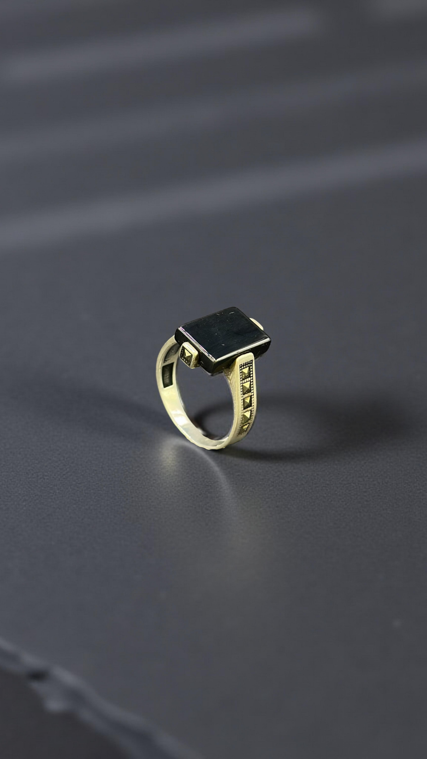 SKU: QZ-SR187 Weight: 6.21g Purity: 925 A bold ring featuring a sleek black onyx centerpiece with pyramid-studded band accents for a modern, edgy look.