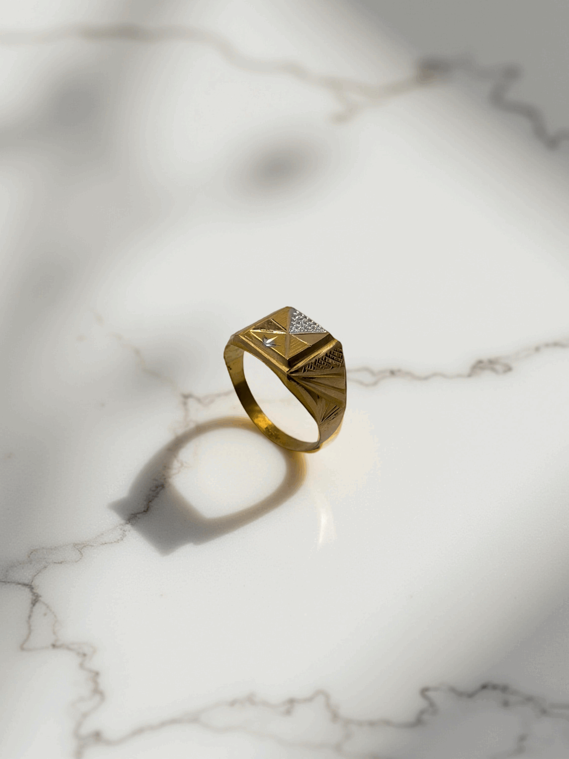 SKU: QZ-R57 Weight: 1.61g Purity: 21k The Pyramid Crest Ring is a fine blend of elegance and simplicity. Its subtle floral detailing adds a graceful touch, making it suitable for everyday wear as well as special events.