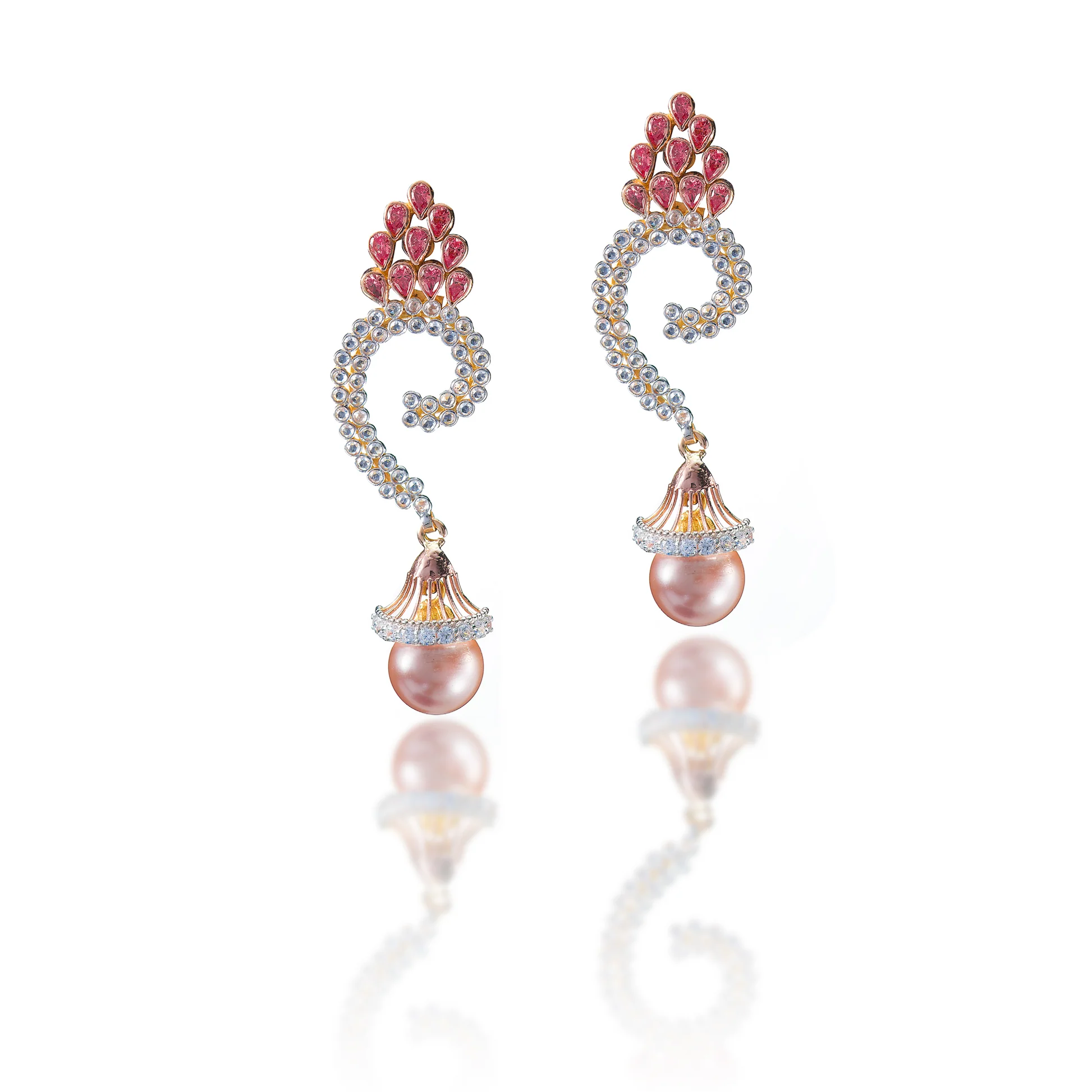 SKU: QZ-ER31 Weight: 8.64g Purity: 21k Gracefully swirling with ruby accents and crowned by blushing pearls, Rosé Plume captures the essence of romantic elegance in motion.