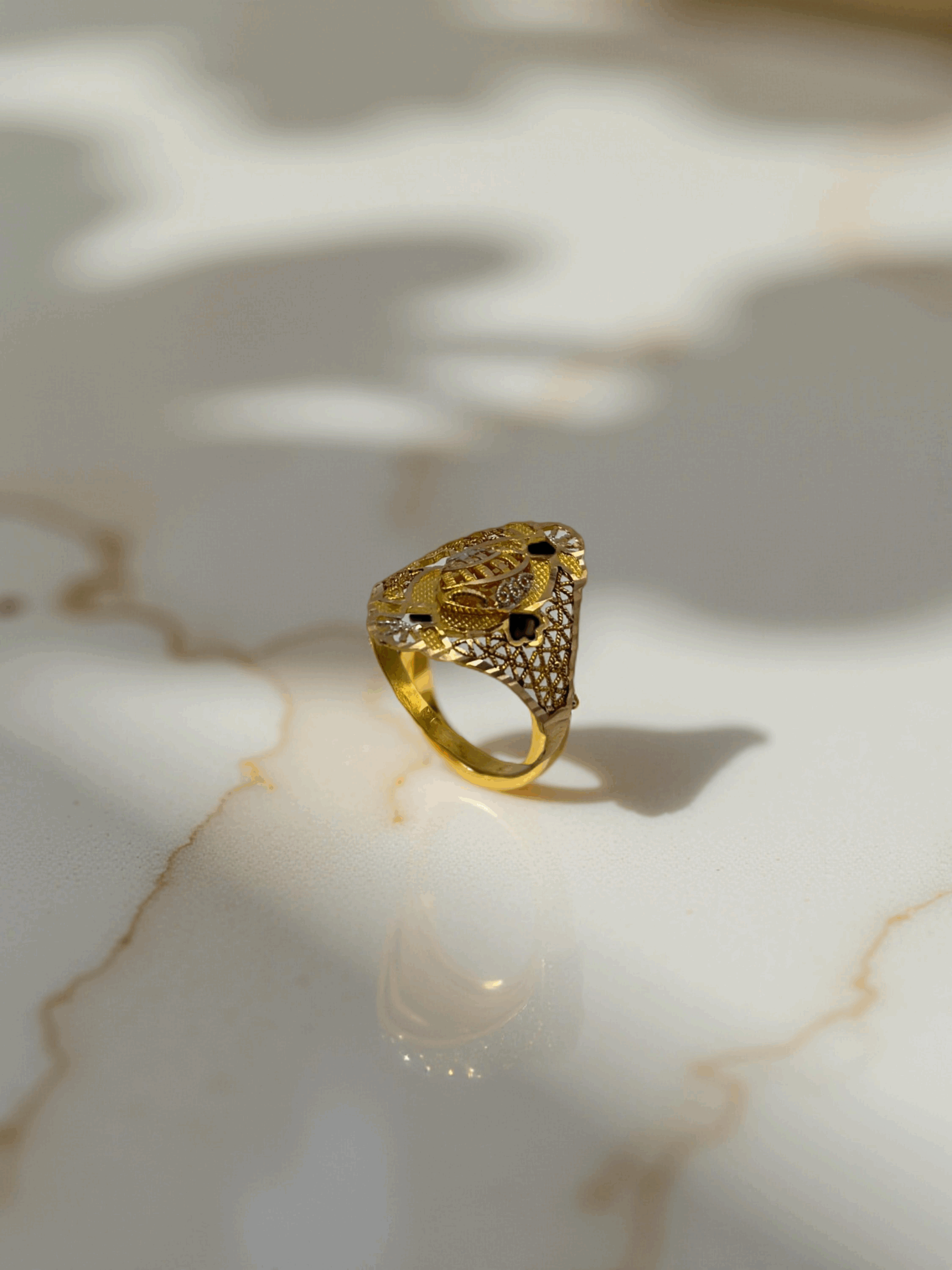 SKU: QZ-R12 Weight: 3.02g Purity: 21k The Black jewel Ring is a fine blend of elegance and simplicity. Its subtle floral detailing adds a graceful touch, making it suitable for everyday wear as well as special events.