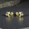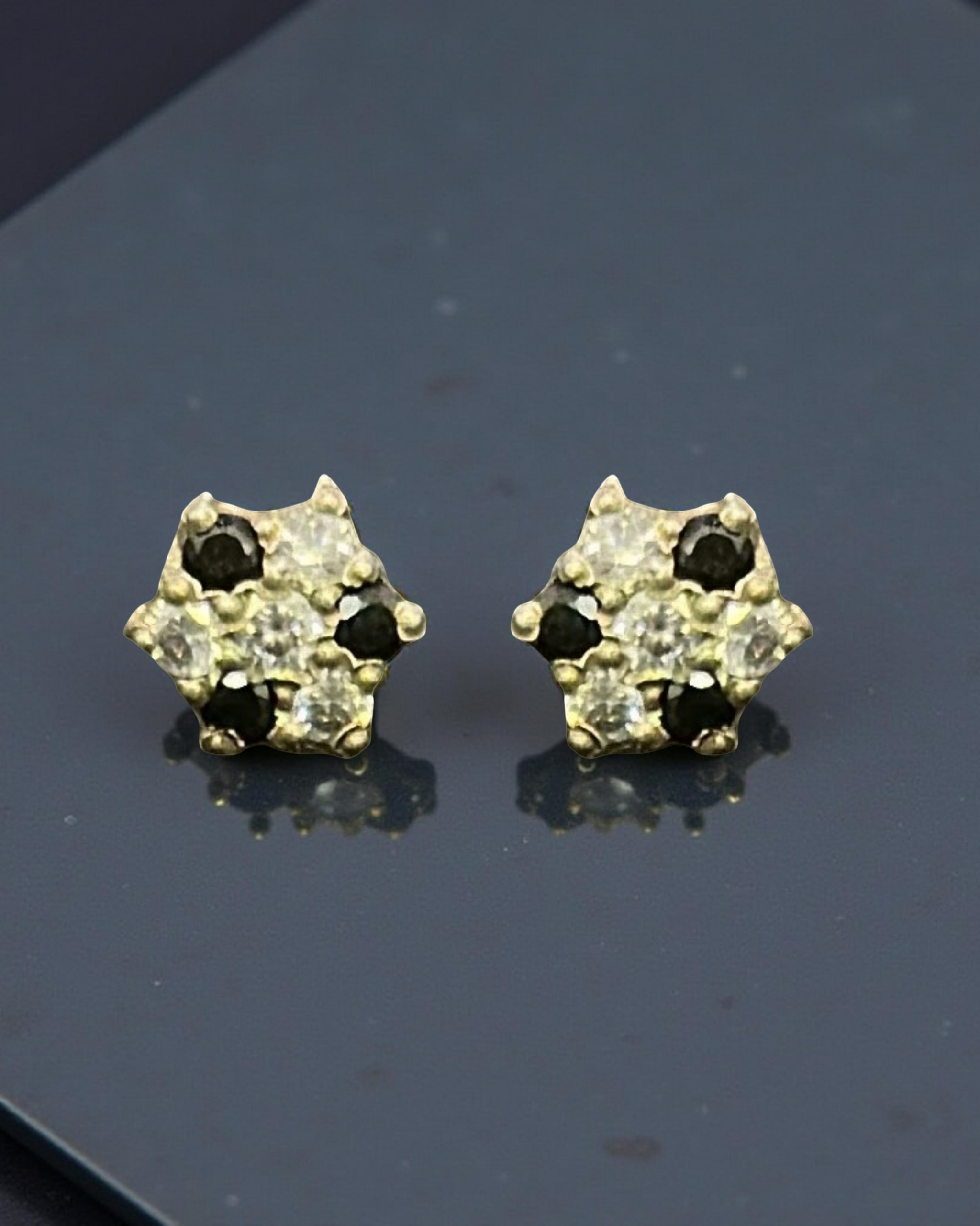 SKU: QZ-ST34 Weight: 0.7g Purity: 925 Silver Black Star Tops featuring a deep blue sapphire center surrounded by sparkling petal-like diamonds in a gold setting.