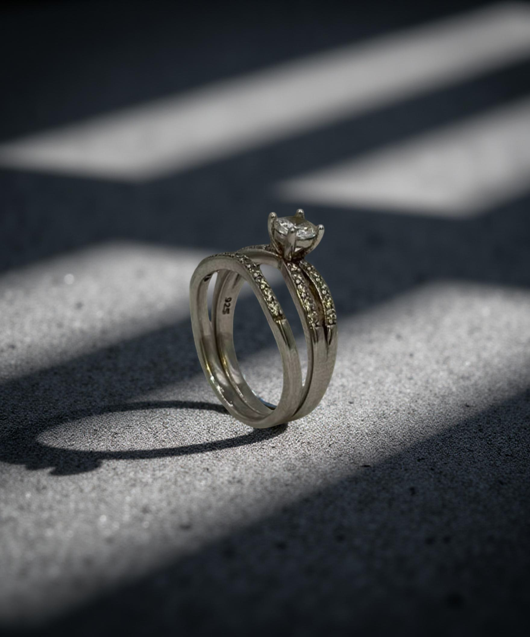 SKU: QZ-SR108 Weight: 4.73g Purity: 925 A sophisticated bridal set with a solitaire diamond engagement ring paired with a complementary diamond-accented wedding band, crafted in sterling silver. Rhodium plating adds extra shine, prevents tarnish, and helps your Italian silver ring resist scratches. It’s also skin friendly for most users.