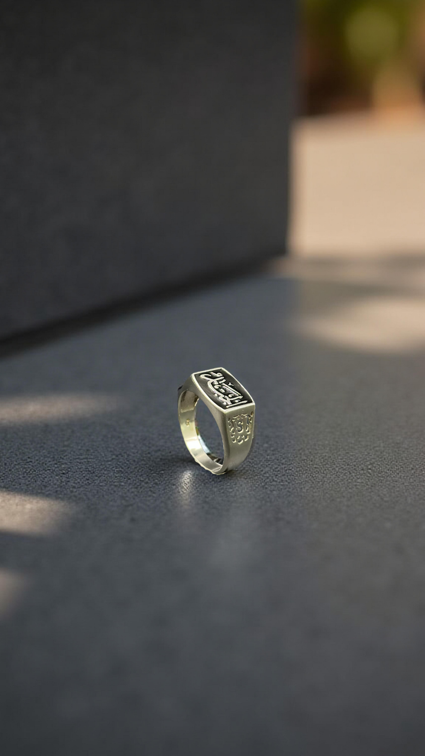 SKU: QZ-SR113 Weight: 5.22g Purity: 925 A sleek silver ring featuring elegant Arabic calligraphy, blending tradition with modern style.
