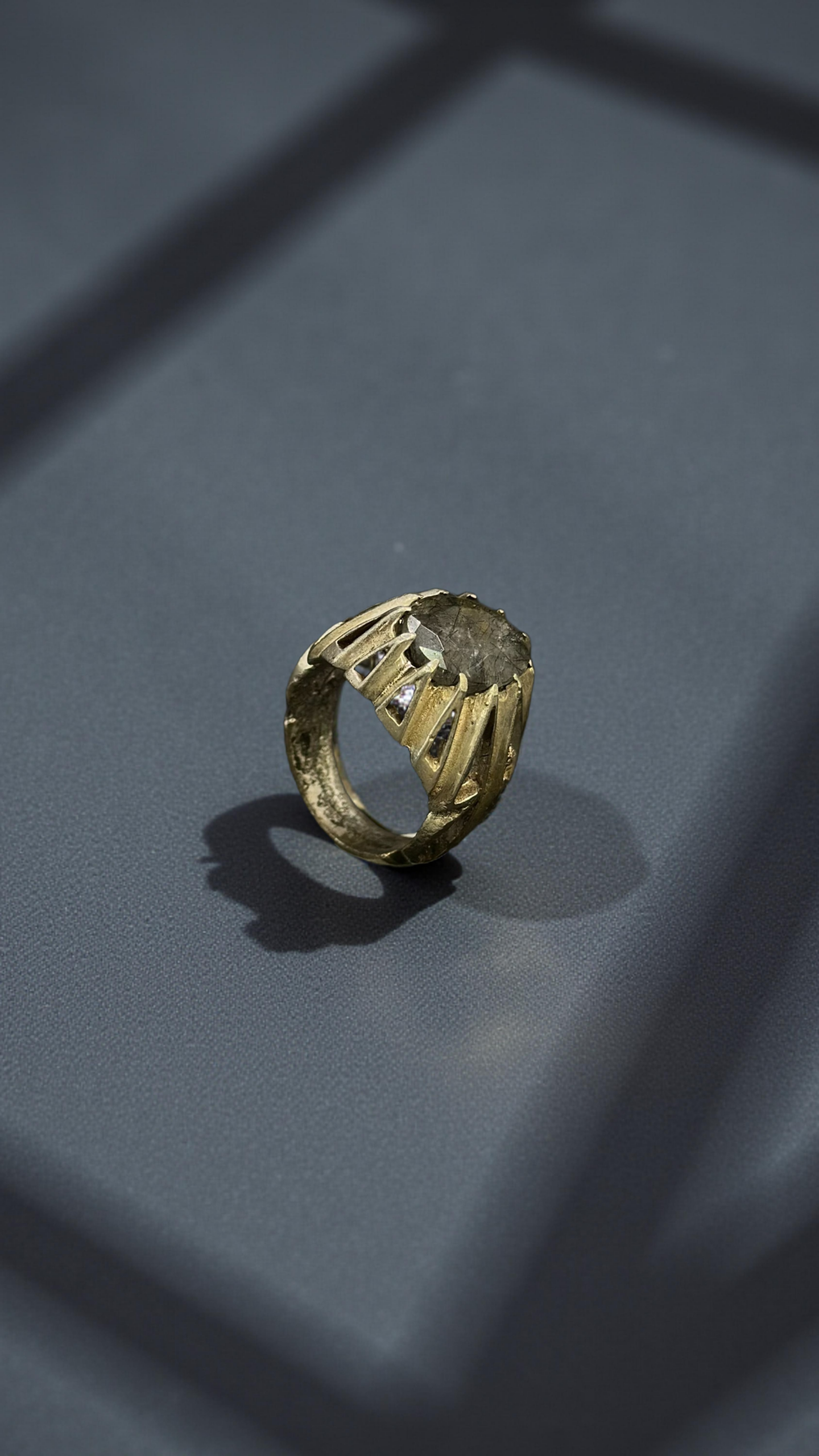 SKU: QZ-SR201 Weight: 11.84g Purity: 925 A bold, raw-textured silver ring with a sunburst design cradling a dark gemstone, echoing the power and mystery of ancient solar artifacts.