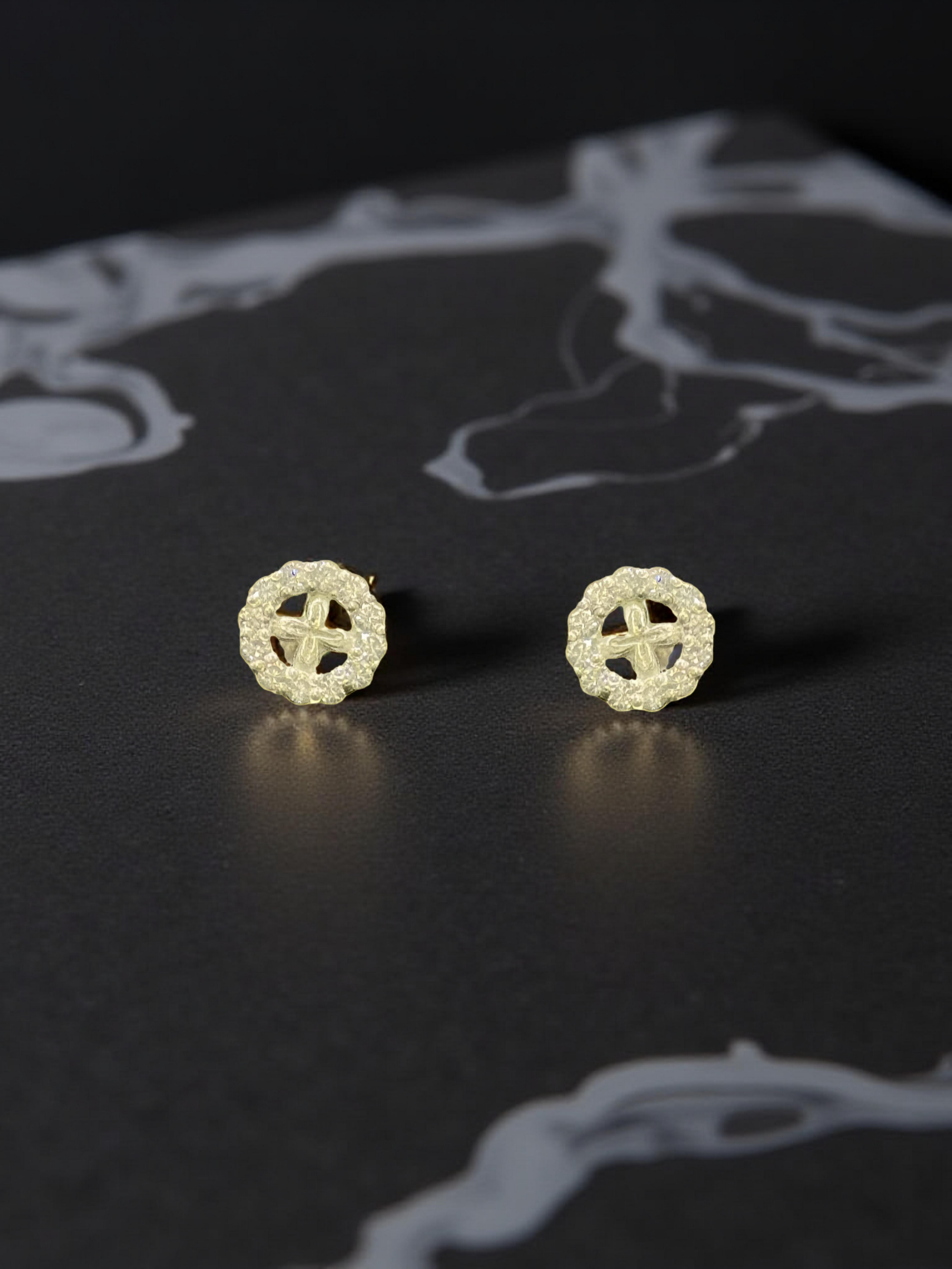 SKU: QZ-ST19 Weight: 1.08g Purity: 925 Unique round gold studs featuring a textured floral frame with an elegant cross-shaped center design.